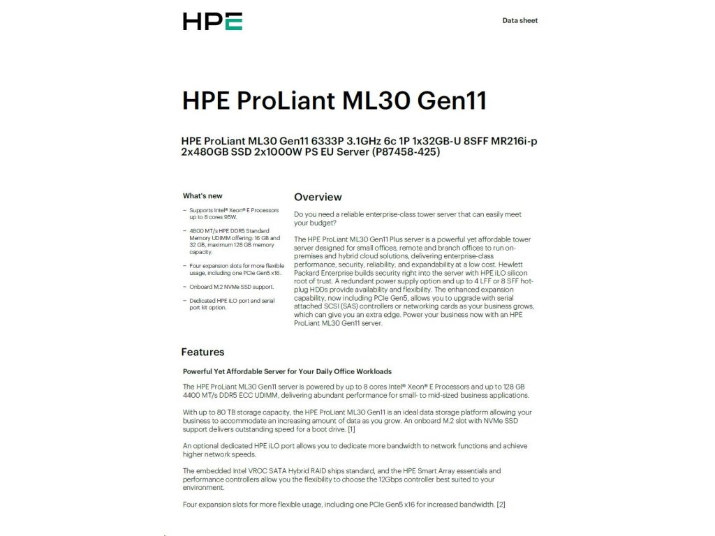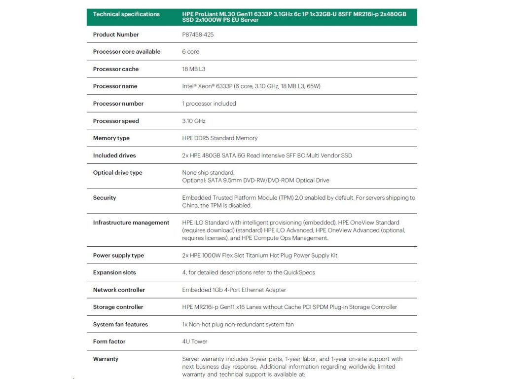 HPE PL ML30g11 6333P (3.1-5.1G/6C12T/65W) 1x32G 2x480G 2x1000W MR216i-p 8SFF 4p1G NBD311 Smart Choice P87458-425