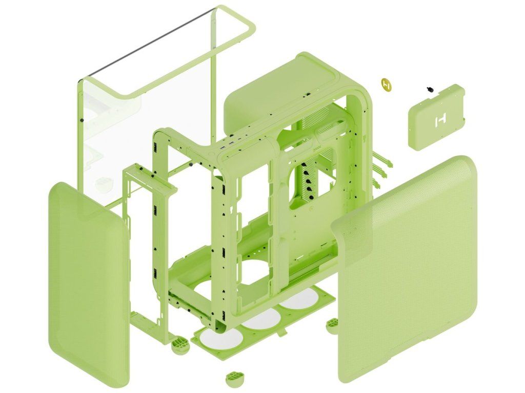 Podpora všech standardních formátů desek od ITX po E-ATX, 7 horizontálních rozšiřujících slotů, úložiště pro 2× 2,5" a 1× 3,5" disky. Strukturální PSU kryt s integrovanými úchytnými body pro snadnou správu kabelů.