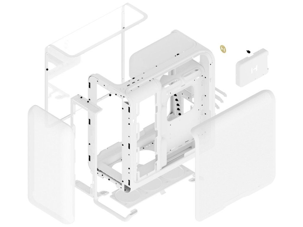 Podpora všech standardních formátů desek od ITX po E-ATX, 7 horizontálních rozšiřujících slotů, úložiště pro 2× 2,5" a 1× 3,5" disky. Strukturální PSU kryt s integrovanými úchytnými body pro snadnou správu kabelů.