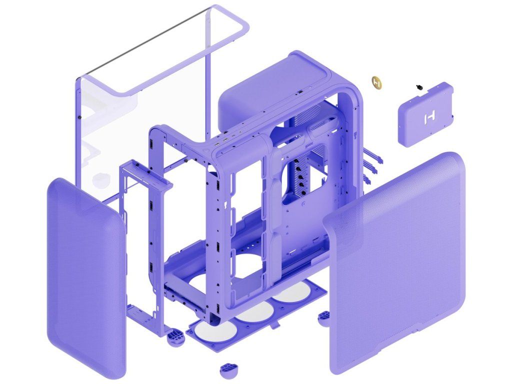 Podpora všech standardních formátů desek od ITX po E-ATX, 7 horizontálních rozšiřujících slotů, úložiště pro 2× 2,5" a 1× 3,5" disky. Strukturální PSU kryt s integrovanými úchytnými body pro snadnou správu kabelů.