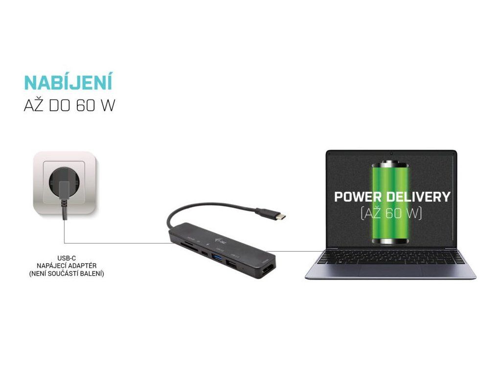 I-TEC USB-C Travel Easy Dock 60 WDokovací stanice nabízející velké množství praktických portů. Připojení k počítači je realizováno skrze USB-C kabel s podporou Thunderbolt 3. Stanice taktéž nabízí USB-C Power Delivery až 60 W, který je určen pro napájení připojeného notebooku či tabletu pomocí vašeho originálního síťového adaptéru. K dokovací stanici lze připojit monitor skrze rozhraní HDMI s maximálním rozlišením až 4K. Jeden USB 3.0 a jeden USB 2.0 port poslouží pro připojení vašich periferií a čtečka SD a microSD karet pomůže s přenosem dat.
