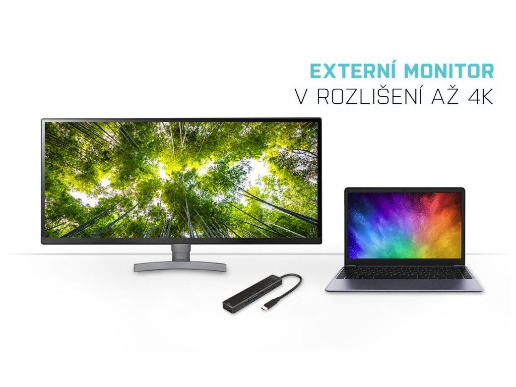 Porty: 1× HDMI, 1× USB 3.0, 1× USB 2.0, 1× USB-C (pouze napájení), 1× čtečka SD karet, 1× čtečka microSD karet