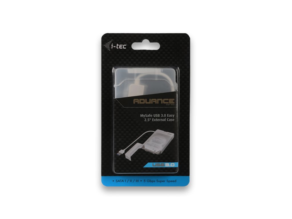 i-tec MySafe USB 3.0 Easy je externí rámeček pro připojení 2.5'' SATA disků všech kapacit k vašemu PC, notebooku, TV či jinému multimediálnímu zařízení pomocí USB rozhraní, přes které je zároveň i napájen. Rámeček je rovněž vhodný k přesunu dat z poškozeného notebooku. Připojení přes USB 3.0 nabízí rychlý a snadný přenos dat (až 5 Gbps). Samozřejmostí je zpětná kompatibilita s USB 2.0. Obsluha je velice jednoduchá, disk pouze vložíte do rámečku a při prvním připojení k počítači se automaticky nainstalují ovladače. Pro rychlé připojení disku můžete použít pouze samostatný adaptér externího rámečku nebo můžete disk bezpečně přenášet v přiloženém plastovém boxu. SPECIFIKACE: • Externí USB 3.0 rámeček pro 2.5'' SATA I /II/III HDD nebo SSD s výškou až 9.5 mm, rychlá a pohodlná výměna disku pro okamžitý přístup k Vašim datům • Rozhraní USB 3.0 pro vysokorychlostní přenos dat (až 5 Gbps), zpětně kompatibilní s USB 2.0 • LED indikátor, funkce Plug & Play, napájení ze sběrnice USB, automatická instalace ovladačů • Napájení: 5V, 900 mA • OS Windows 2000 / XP / Vista / 7 / 8 / 8.1 / 10 32/64 bit, Mac OS X • Rozměry produktu: 130 x 74 x 16 mm • Hmotnost produktu: 60 g • Rozměry balení: 192 x 112 x 20 mm • Hmotnost balení: 75 g SYSTÉMOVÉ POŽADAVKY Hardwarové požadavky PC nebo notebook s volným USB portem Operační systém Windows XP, Windows Vista, Windows 7 32/64bit, Windows 8 32/64bit, Windows 8.1 32/64bit, Windows 10 32/64bit, Mac OS 10.x a vyšší – automatická instalace ovladačů ze systému OBSAH BALENÍ • USB 3.0 adaptér pro 2.5'' HDD s integrovaným kabelem (15 cm) • Plastový box • Uživatelská příručkaDodatočné parametre