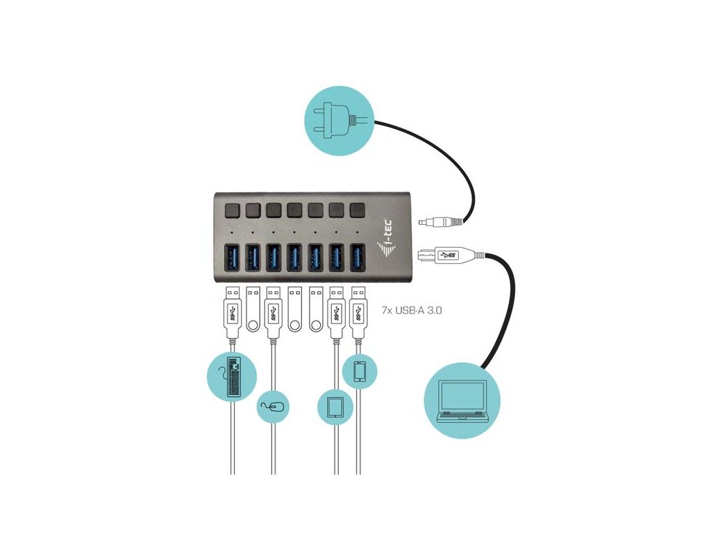 Tento HUB nabízí 7 USB 3.0 portů s funkcí Plug & Play a standardním USB nabíjením – HUB automaticky detekuje, jestli je připojeno zařízení pro USB nabíjení. Díky tomu, že HUB má 7 USB 3.0 portů, je možno nabíjet až 7 zařízení najednou. Rozhraní USB 3.0 je důležité zejména pro datové přenosy z USB 3.0 paměťových karet a flash disků, kde se nejvíce využije jeho vysoká přenosová rychlost. K balení je přiložen externí napájecí adaptér, který vám zaručí stabilní nabíjení z USB portů a výkon HUBu, poskytující nabíjecí výkon až 10 W na jeden port.Jednotlivé porty HUBu je možné vypnout či zapnout příslušným vypínačem, čímž ušetříte spotřebu HUBu a zároveň zvýšíte dobíjecí příkon na portech, které ponecháte zapnuté.