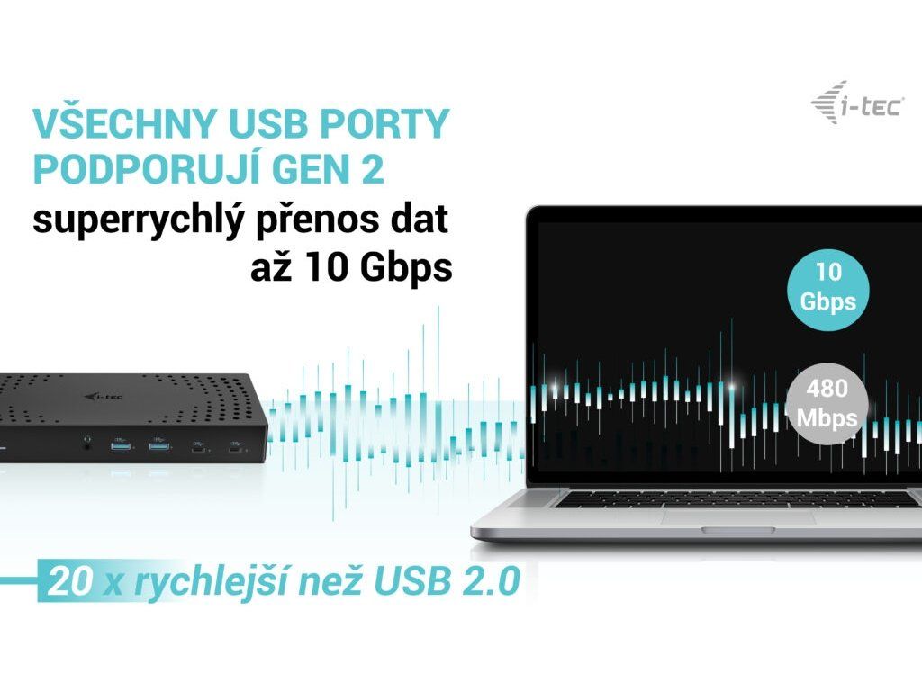 • Maximálně výkonná dokovací stanice až pro tři monitory současně • Dokovací stanice je kompatibilní se všemi moderními notebooky (připojení přes porty USB 3.0, USB-C nebo Thunderbolt™ 3/4). • Podporuje vysoké rozlišení 4K s obnovovací frekvencí až 60 Hz • Dokovací stanice podporuje až 100W napájení připojeného notebooku nebo tabletu (při připojení k příslušnému portu USB-C nebo ThunderboltTM. Při připojení k portu USB 3.0 nelze notebook nabíjet). • 4x USB 3.2 Gen 2 (10 Gb/s) a 2x USB-C Gen (10 Gb/s) umožňují snadné připojení zařízení a periferií USB. • GLAN Ethernet podporuje síťové rychlosti 10/100/1000 Mb/s a poskytuje robustní a vysokorychlostní připojení k internetu. • Kombinovaný 3,5mm audio/mikroport umožňuje připojit například integrovaná sluchátka s mikrofonem. • Dokovací stanice je kompatibilní pro vertikální montáž za monitor s podporou montáže VESA • Volitelné klonování MAC adresy a automatické zálohování dat připojeného počítače (při použití softwaru i-tec Docker Pro). Výkonná profesionální dokovací stanice Gen 2, která podporuje výstup až na tři externí monitory ve vysokém rozlišení až 4K. Dokovací stanici lze použít prakticky se všemi notebooky, protože podporuje připojení ke všem běžným portům: 3.0, USB-C a Thunderbolt“ 3/4 a zároveň podporuje všechny běžné současné operační systémy. Připojení ke třem monitorům však bude možné pouze v případě, že je notebook vybaven portem Thunderbolt“ 3/4 nebo portem USB-C, který podporuje přenos videa (režim USB-C DP Alt). V případě připojení k notebooku s portem USB 3.0 budou podporovány pouze dva monitory. Dostatek portů USB (všechny podporují rychlost Gen 2 až 10 Gb/s), spolehlivé a rychlé připojení k firemní síti díky integrovanému portu LAN a podpora instalace za monitor, to vše dělá z této dokovací stanice ideálního společníka pro opravdové profesionály. Samozřejmě podporuje nabíjení notebooku nebo tabletu, a to až do výkonu 100 W. • Připojení 3 externích monitorů s rozlišením až 4K*. • Výkon: až 100 W • K dispozici 2 porty DisplayPort a 3 porty HDMI* • 4x USB 3.2 Gen 2 (10 Gb/s) a 2x USB-C Gen 2 (10 Gb/s) umožňují snadné připojení zařízení a periferií USB • Gigabitový Ethernet RJ-45 poskytuje spolehlivé, robustní a vysokorychlostní připojení k internetu s podporou rychlostí 10/100/1000 Mb/s • Kombinovaný konektor pro zvuk a mikrofon • Zámek Kensington poskytuje ochranu proti krádeži, zejména ve sdíleném kancelářském prostředí nebo na veřejných místech • Vypínač napájení dokovací stanice umožňuje maximální úsporu energie • Dokovací stanice podporuje držák VESA pro inteligentní vertikální instalaci za monitor s podporou VESA • Podporuje systémy Windows 10 / 11, macOS, Android 5 nebo novější, Chrome OS R51 nebo novější, Linux Ubuntu *Port HDMI 3 bude fungovat pouze po připojení k notebooku s portem Thunderbolt“ 3/4 nebo portem USB-C podporujícím přenos videa (tzv. režim USB-C DP Alt). Pokud je dokovací stanice připojena přes port USB 3.0, nabíjení není podporováno Specifikace • 1x port USB-C pro připojení zařízení USB-C (ThunderboltTM) nebo USB-A (kabel USB-C a adaptér USB-C na USB 3.0 jsou součástí dodávky) • Technologie dokovací stanice: DisplayLink + režim USBC DP Alt + USB-C PD • Power Delivery: 100 W • Video porty: - 3x HDMI - 2x DP • Rozlišení : - 1 monitor – 1x Display Port › až 4K/60Hz - 1 monitor – 1x HDMI 1/2› až 4K/60Hz - 1 monitor – 1x HDMI 3* › až 4K/60Hz (nebo až 1440p/144Hz) - 2 monitory – 1x Display Port/HDMI 1/2+ 1x Display Port/HDMI 1/2› až 2x 4K/60Hz - 2 monitory – 1x Display Port/HDMI 1/2+ 1x HDMI 3* › až 4K/60Hz a 4K/60Hz - 3 monitory – 1x Display Port/HDMI 1/2+ 1x Display Port/HDMI 1/2+ 1x HDMI 3* › až 3x 4K/60Hz • 4x USB-A 3.2 Gen 2 (10Gb/s) • 2x USB-C 3.2 Gen 2 (10Gbps) • 1x port Ethernet GLAN RJ-45 (DisplayLink DL-6950) • 1x 3,5mm kombinovaný audio konektor • Klonování MAC adresy: ano (za použití software i-tec Docker Pro) • WOL: S1, S2, S3 • Podpora zámku Kensington • Podpora montáže VESA • Kabel USB-C na USB-C/USB-A (100 cm) • 1x vstup napájení (DC 20V/8A) • Indikátor LED • Rozměry produktu: 223 x 92 x 30 mm • Hmotnost produktu: 365 g • Rozměry balení: 260 x 250 x 50 mm * Port HDMI 3 funguje pouze v případě, že je dokovací stanice připojena k portu Thunderbolt™ nebo USB-C (podporujícímu režim DisplayPort Alt). Hardwarové požadavky: Zařízení s volným portem USB-A, USB-C nebo Thunderbolt™ 3/4. Požadavky na funkci Power Delivery: Zařízení s volným portem USB-C nebo Thunderbolt™3 s podporou funkce „Power Delivery“. Požadavky na výstup HDMI 3: Zařízení s volným portem USB-C s podporou „DisplayPort Alternate Mode“ nebo portem Thunderbolt™ 3/4. Operační systém: Windows 10 / 11, macOS, Android 5 nebo novější, Chrome OS R51 nebo novější, Linux Ubuntu. Pokud je dokovací stanice připojena přes USB 3.0, není podporováno nabíjení notebooků a tabletů. Obsah balení • Produkt • Napájecí adaptér 160W • Kabel USB-C na USB-C/USB-A (100 cm) • ManuálDodatočné parametre