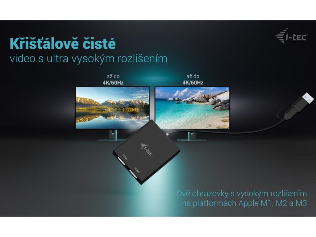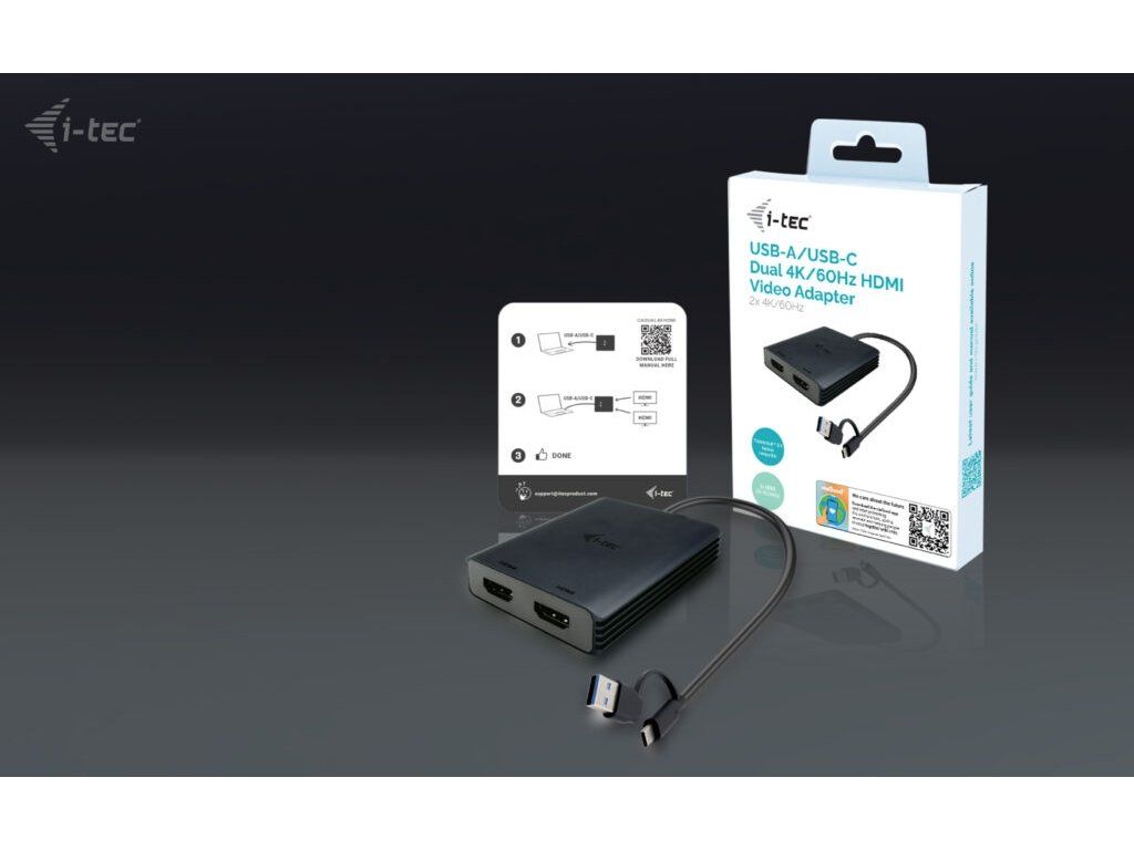 • Univerzální konektivita: kompatibilní s porty USB-C, USB-A a Thunderbolt • Výkonný a všestranný video adaptér, který dokáže připojit až dva monitory současně. • Adaptér podporuje rozlišení až 2x 4K/60 Hz bez ohledu na výkon grafické karty vašeho notebooku. • Podpora dvou HDMI portů. • Kovový povrch pro lepší odvod tepla. • Dva externí monitory jsou také podporovány na platformách Apple M1, M2 a M3. • Adaptér je kompatibilní se všemi hlavními operačními systémy. Rozšiřte svou pracovní plochu o dva externí HDMI monitory. Adaptér podporuje 2x 4K rozlišení 4096×2160@60Hz včetně audio signálu. Adaptér je vhodný pro designéry, grafiky a další uživatele, kteří pracují s více obrazovkami současně. Jeho výkon vám umožní spouštět i ty nejnáročnější aplikace na jednom nebo dvou nezávislých displejích, takže je ideální pro střih 4K/60Hz videí nebo jiné Ultra HD úlohy. S režimy „Rozbalit“ a „Zrcadlit“ můžete pracovat s aplikacemi na dvou monitorech (např. velké tabulky), pracovat na jednom monitoru a na druhém vyhledávat informace na internetu, porovnávat několik dokumentů najednou, aniž byste museli neustále přeskakovat otevírat okna, prohlížet panoramatické snímky na dvou monitorech, prohlížet grafy a aktuální data současně, prohlížet několik prezentací najednou bez nutnosti mít další počítač atd. Před použitím adaptéru je nutná krátká jednorázová instalace ovladače DisplayLink. Více informací naleznete na http://www.i-tec.pro/setup-2. Specifikace • 1x integrovaný USB-C/USB-A kabel pro připojení k hostitelskému zařízení (27 cm) • Technologie grafického adaptéru: DisplayLink Video porty: 2x HDMI Podporovaná rozlišení: 1 monitor – 1x HDMI › až 1x 4K/60Hz 2 monitory – 1x HDMI + 1x HDMI › až 2x 4K/60 Hz • OS: Windows 10/11, macOS, Android 5 nebo novější, Chrome OS R51 nebo novější, Linux Ubuntu • Rozměry produktu: 75 x 60 x 15 mm • Hmotnost produktu: 80 g • Rozměry balení: 180 x 130 x 25 mm • Hmotnost balení: 180 g Hardwarové požadavky: Zařízení s volným portem USB-A, USB-C, USB4 nebo Thunderbolt™ 3/4 Obsah balení • Produkt • QuickStartDodatočné parametre