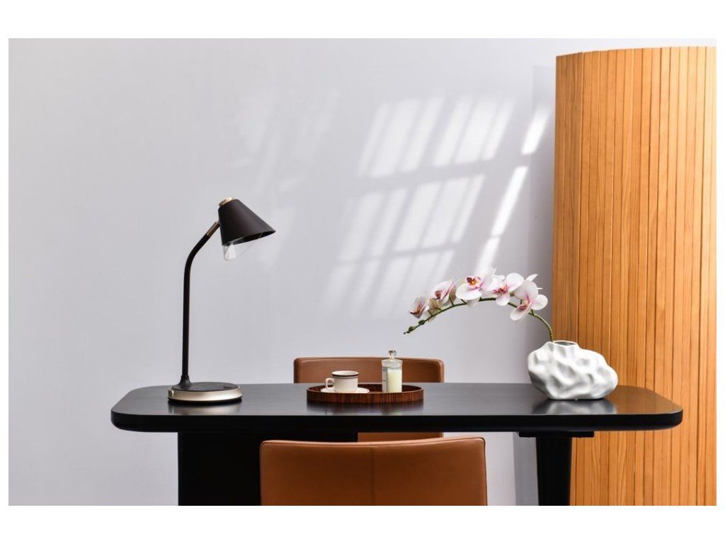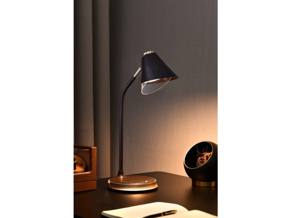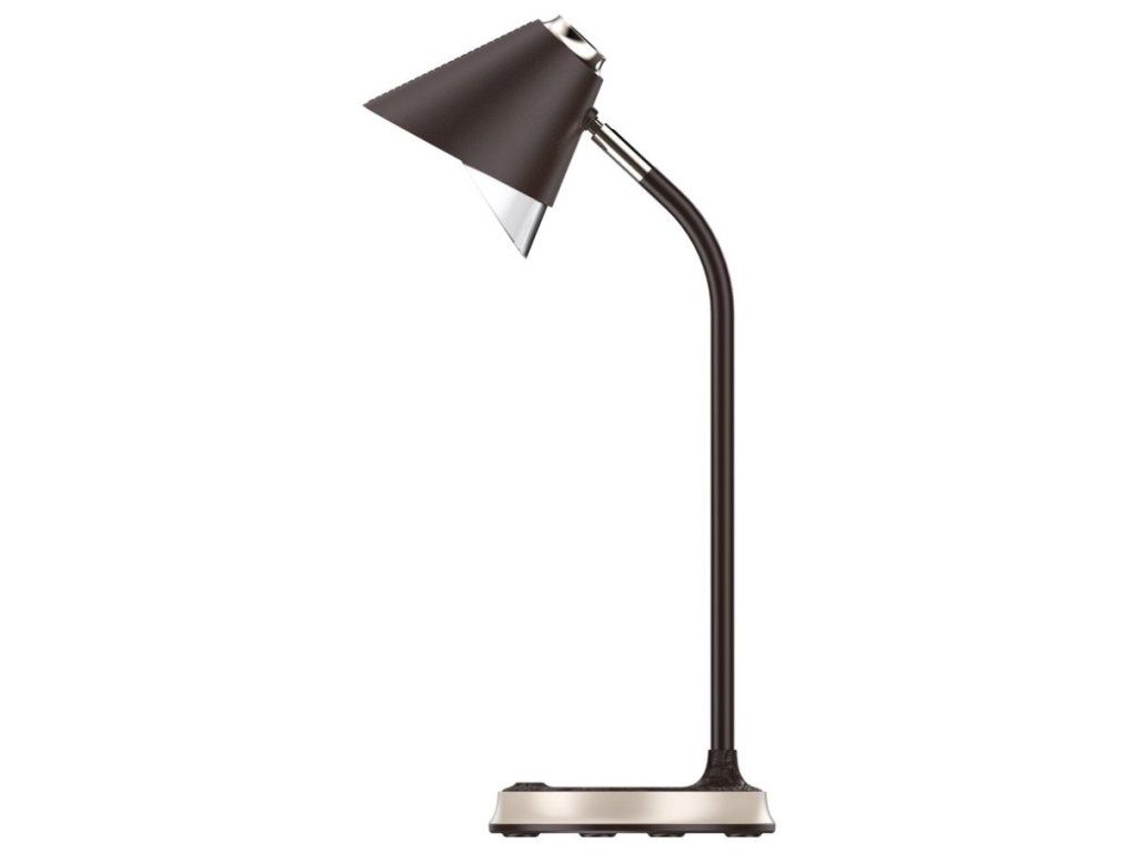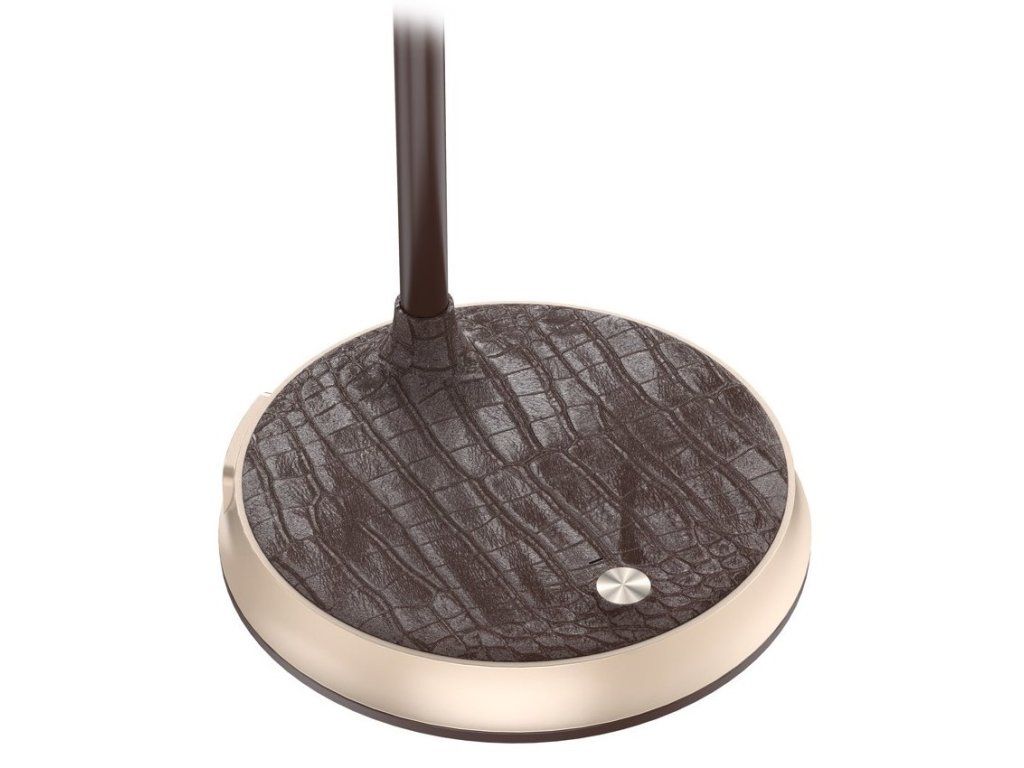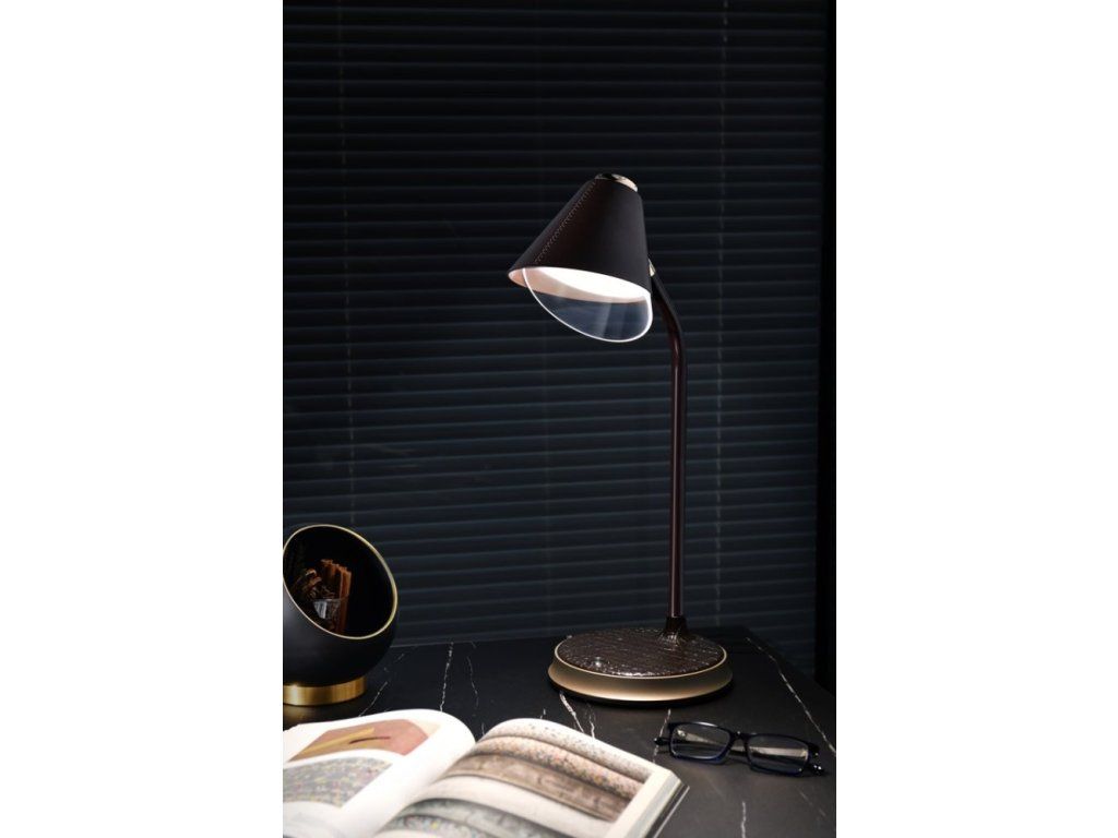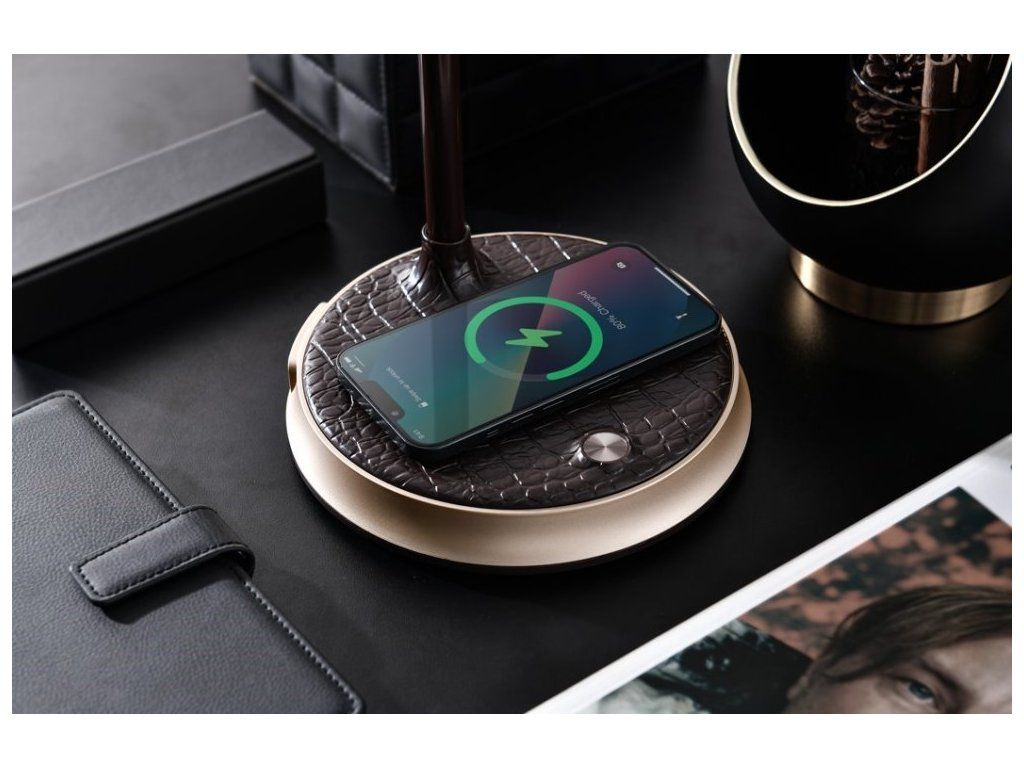 IMMAX FINCHPraktická stolní lampička s pokročilou LED technologií, naklápěcí hlavou a nadčasovým designem. Hnědá imitace kůže v kombinaci se zlatými prvky z ní dělá také stylový vizuální doplněk, vhodný například do reprezentativních kancelářských prostor. Nastavení intenzity osvětlení i barevné teploty probíhá pomocí jediného dotykového tlačítka. Lampička je vybavena také bezdrátovou nabíječkou standardu Qi nabízející výkon 10 W. Mobilní telefon s podporou bezdrátového nabíjení se začne nabíjet při pouhém položení na nabíjecí plochu.