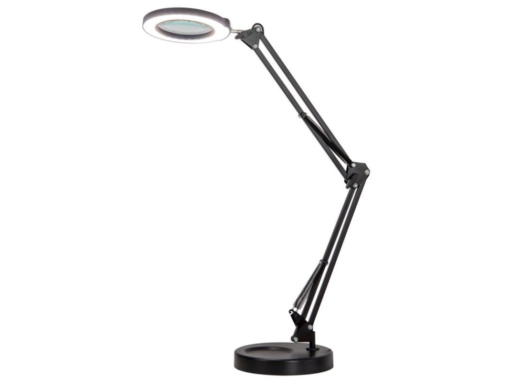 Stmívatelná stolní LED lampička se zvětšovací skleněnou čočkou vhodná do dílen, kosmetických salonů, kanceláří atd. Lampu lze postavit na plochu nebo pevně upevnit kovovou svorkou na okraj stolu. Disponuje flexibilním ramenem o délce 70 cm a natáčecí hlavou ve všech směrech, což umožňuje perfektní nastavení osvětlení při práci. Ovládání lampičky je velmi snadné díky dotykovým tlačítkům. Dostatečný průměr lupy (skla) o velikosti 10 cm umožňuje efektivní práci s lupou.