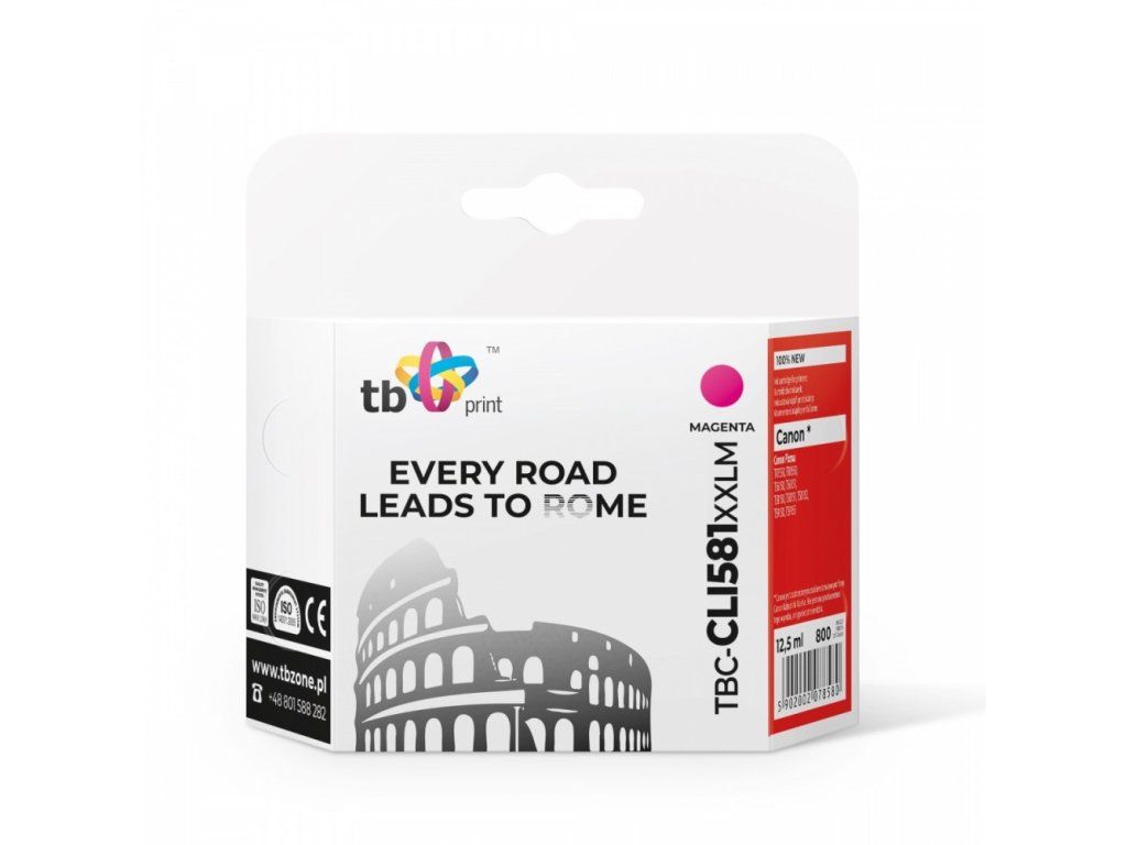 TB Print je dlouholetým výrobcem alternativních kazet pro celou řadu tiskáren světových výrobců. Kazety a tonery splňují nejpřísnější nároky na kvalitu i tisk samotný. TB Print je synonymum pro dokonalé věrný, ostrý tisk a to za stále atraktivní cenu. Barva: Magenta Výtěžnost: 800 stran Kompatibilita:Canon Pixma TR7550/TR8550/TS6150/TS6151/TS8150/TS8151/TS8152/TS9150/TS9155Dodatočné parametre