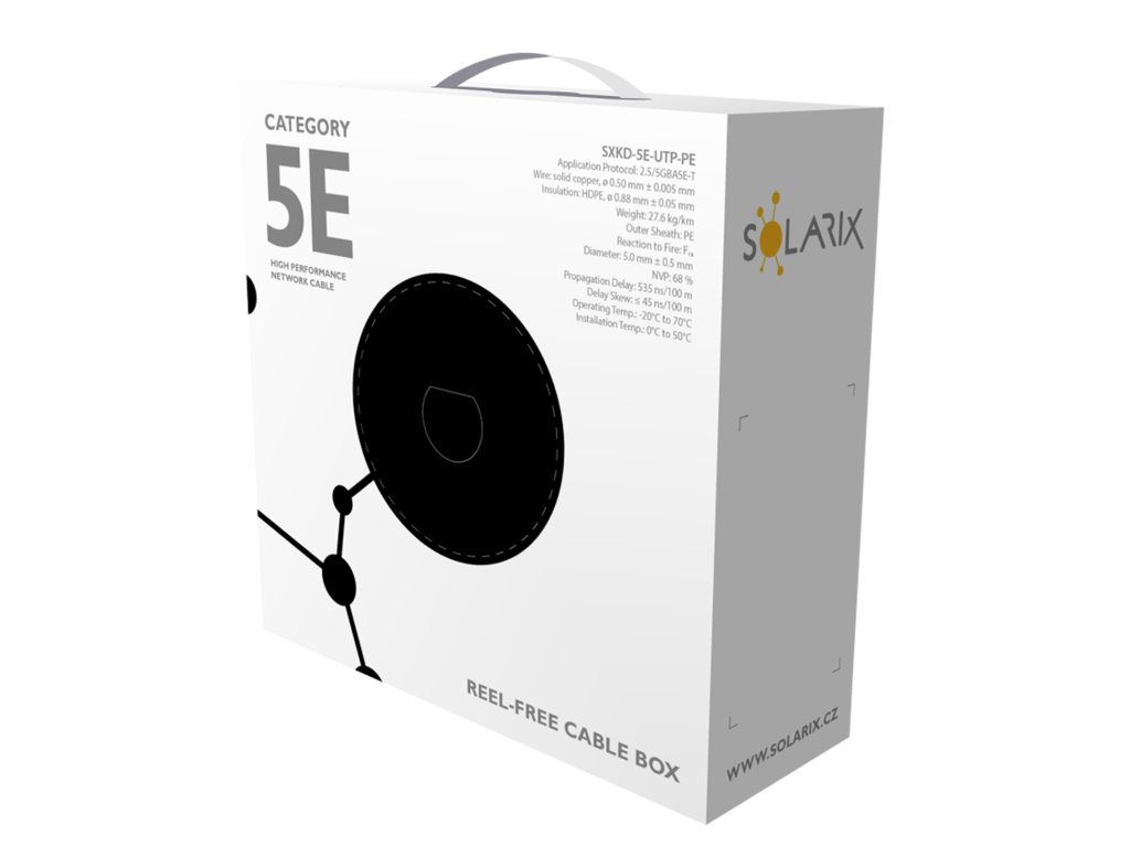 Instalační kabel Solarix s označením SXKD-5E-UTP-PE je spolehlivý venkovní nestíněný kabel kategorie 5E, který je určený pro provoz ethernetových protokolů, včetně 2.5GBASE-T a 5GBASE-T*. Konstrukce kabelu je U/UTP, typ pláště UV stabilní PE s třídou reakce na oheň Fca a stupněm krytí IP67. Vodiče kabelu jsou vyrobeny z kvalitního měděného drátu s čistotou mědi 99,97 %. Kabel bez problémů splňuje požadavky z mezinárodních standardů ISO/IEC 11801, EN 50173 a ANSI/TIA 568.2-D. Stejně jako ostatní kabely Solarix, je i kabel SXKD-5E-UTP-PE značen metráží po 1 m v rozsahu od 0 do 100 m. Kabel je dodáván ve vysoce odolném třívrstvém leštěném kartónovém boxu (vždy barevně odlišeném podle typu kabelu), na kterém jsou uvedeny všechny nezbytné produktové informace, včetně čárových kódů, výrobní šarže, popisu a nejdůležitějších technických parametrů. Tento kabel není určen pro trvalé uložení do vody ani do země bez odpovídající řádné ochrany. Technické parametry Kategorie: CAT5E Podporované protokoly: 2.5/5GBASE-T a nižší Stínění: ne Šířka pásma: 100 MHz Typ a velikost vodiče: měděný drát 0,50 mm ± 0,005 mm Izolace a průměr vodiče s izolací: HDPE 0,88 mm Třída reakce na oheň, typ pláště: Fca, PE Barva pláště: černá RAL 9005 Průměr kabelu: 5,0 mm Váha: 27,6 kg/km NVP: 68 % Propagation delay: 535 ns/100 m Delay skew: nižší než 45 ns/100 m Skladovací teplota: -20 °C až 70 °C Provozní teplota: -20 °C až 70 °C Teplota při instalaci: 0 °C až 50 °C Balení: 100 m, třívrstvý kartónový box Rozměry balení (výška x hloubka x šířka): 260 mm x 260 mm x 120 mm Počet balení na paletě: 128 boxůDodatočné parametre