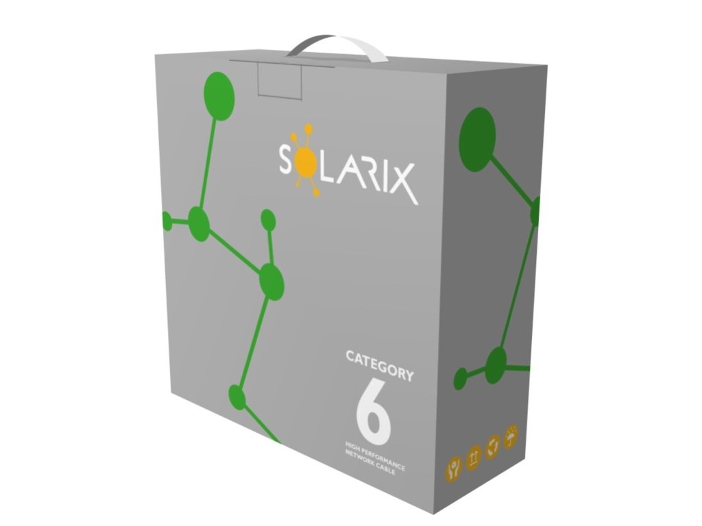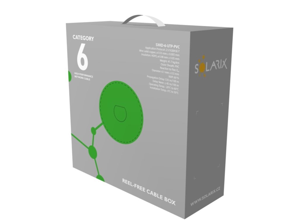 POZOR, nový 100 m box. Instalační kabel Solarix s označením SXKD-6-UTP-PVC je spolehlivý nestíněný kabel kategorie 6, který je určený pro provoz ethernetových protokolů, včetně 2.5GBASE-T a 5GBASE-T. Konstrukce kabelu je U/UTP s plastovým křížem, který zajišťuje maximální oddělení párů od sebe po celé délce kabelu. Typ pláště je PVC s třídou reakce na oheň Eca. Vodiče kabelu jsou vyrobeny z kvalitního měděného drátu s čistotou mědi 99,97 %. Kabel bez problémů splňuje požadavky z mezinárodních standardů ISO/IEC 11801, EN 50173 a ANSI/TIA 568.2-D. V případě CPR (nařízení EU č. 305/2011) je kabel testován u nezávislé laboratoře FORCE TECHNOLOGY v systému posuzování vlastností AVCP 3. Stejně jako ostatní kabely Solarix, je i kabel SXKD-6-UTP-PVC značen metráží po 1 m v rozsahu od 0 do 100 m. Kabel je dodáván ve vysoce odolném třívrstvém leštěném kartónovém boxu, na kterém jsou uvedeny všechny nezbytné produktové informace, včetně čárových kódů, výrobní šarže, popisu a nejdůležitějších technických parametrů. Technické parametry Kategorie: CAT6 Podporované protokoly: 2.5/5GBASE-T a nižší Stínění: ne Šířka pásma: 250 MHz Typ a velikost vodiče: měděný drát 0,55 mm ± 0,005 mm Izolace a průměr vodiče s izolací: HDPE 0,98 mm Třída reakce na oheň, typ pláště: Eca, PVC Barva pláště: šedá RAL 7035 Průměr kabelu: 6,1 mm Váha: 41,7 kg/km NVP: 69 % Propagation delay: 535 ns/100 m Delay skew: nižší než 45 ns/100 m Skladovací teplota: -20 °C až 60 °C Provozní teplota: -20 °C až 60 °C Teplota při instalaci: 0 °C až 50 °C Balení: 100 m, třívrstvý kartónový box Rozměry balení (výška x hloubka x šířka): 315 mm x 315 mm x 120 mm Počet balení na paletě: 72 boxůDodatočné parametre