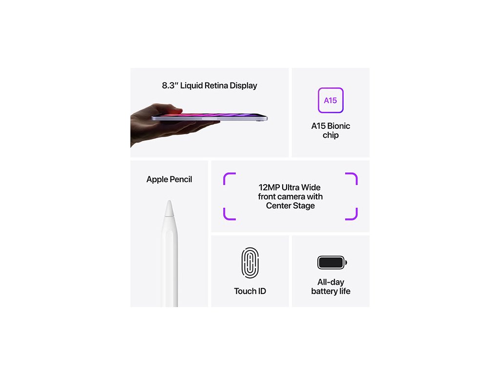 Nový iPad mini. Má 8,3-palcový Liquid Retina displej cez celú plochu. Výkonný čip A15 Bionic s Neural Enginom. 12 MP ultraširokouhlú prednú kameru s centrovaním záberu. Rozhranie USB-C. Rob si poznámky, edituj dokumenty a zachytávaj svoje najlepšie nápady Apple Pencilom (2. generácie), ktorý sa prichytáva magneticky a nabíja bezdrôtovo. Hlavné vlastnosti - 8,3-palcový Liquid Retina displej s True Tone a širokým farebným rozsahom - Čip A15 Bionic s Neural Enginom - Touch ID na bezpečné overovanie a Apple Pay - 12 MP širokouhlý zadný fotoaparát, 12 MP ultraširokouhlá predná kamera s centrovaním záberu - Fialový, hviezdne biely, ružový a vesmírne šedý - Stereo reproduktory na šírku - Pripojenie cez ultrarýchlu Wi-Fi 6 - Výdrž batérie až 10 hodín - Konektor USB-C na nabíjanie a pripojenie doplnkov - Funguje s Apple Pencilom (2. generácie) - iPadOS 15 má mimoriadny výkon, ľahko sa ovláda a je navrhnutý priamo pre všestranný iPadDodatočné parametre