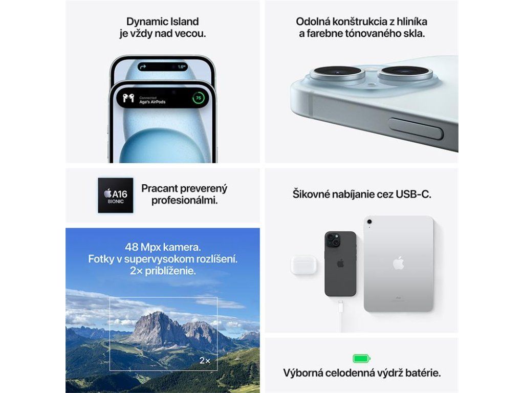 iPhone 15 vám prináša Dynamic Island, 48MP hlavný fotoaparát a USB - C to všetko v odolnom farebnom prevedení zo skla a hliníka. DYNAMIC ISLAND PRICHÁDZA NA IPHONE 15 - Dynamic Island zobrazuje upozornenia a aktivity naživo - takže ich nepremeškáte, keď robíte niečo iné. Môžete vidieť, kto vám volá, skontrolovať stav letu a ešte oveľa viac. INOVATÍVNY DIZAJN - iPhone 15 sa vyznačuje odolným farebným sklom a hliníkovým dizajnom. Je odolný voči vode a prachu. Predná strana Ceramic Shield je tvrdšia ako sklo akéhokoľvek smartfónu. A 6,1" Super Retina XDR displej je na slnku až 2x jasnejší v porovnaní s iPhone 14. 48 Mpx HLAVNÝ KAMERA S 2X TELEPHOTO - 48 Mpx hlavný fotoaparát sníma v super vysokom rozlíšení. Takže je jednoduchšie ako kedykoľvek predtým robiť výnimočné fotografie s úžasnými detailmi. Teleobjektív 2x optickej kvality vám umožní vytvoriť dokonalý detail. PORTRÉTY NOVEJ GENERÁCIE - Zachyťte portréty s výrazne väčším množstvom detailov a farieb. Stačí klepnúť na presunutie zaostrenia medzi objektmi - dokonca aj po nasnímaní záberu. BIONICKÝ ČIP POWERHOUSE A16 - Superrýchly čip poháňa pokročilé funkcie, ako je výpočtová fotografia, plynulé prechody Dynamic Island a hlasová izolácia pre telefónne hovory. A A16 Bionic je neuveriteľne efektívny a pomáha poskytovať skvelú celodennú výdrž batérie. PRIPOJENIE USB-C - Konektor USB-C vám umožňuje nabíjať váš Mac alebo iPad rovnakým káblom, aký používate na nabíjanie iPhone 15. Môžete dokonca použiť iPhone 15 na nabíjanie Apple Watch alebo AirPods. DÔLEŽITÉ BEZPEČNOSTNÉ FUNKCIE - Vďaka detekcii zrážky dokáže iPhone zistiť vážnu autonehodu a privolať pomoc, ak to nedokážete. NAVRHNUTÝ PRE ZMENU - iPhone sa dodáva s ochranou súkromia, ktorá vám pomôže udržať si kontrolu nad vašimi údajmi. Je vyrobený z väčšieho množstva recyklovaných materiálov, aby sa minimalizoval dopad na životné prostredie. A má vstavané funkcie, vďaka ktorým je iPhone prístupnejší pre všetkých.Dodatočné parametre