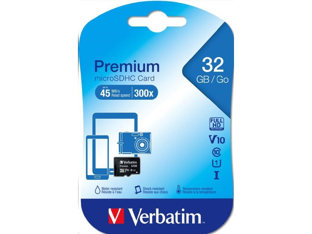Pamäťové karty Verbatim Premium U1 Micro SDHC/SDXC Pamäťové karty Verbatim Premium microSD rozširujú vstavanú pamäť vašich mobilných zariadení, ako sú smartfóny a tablety. S kapacitou až 128 GB môžete zachytiť viac vysokokvalitných fotografií a videí v rozlíšení Full HD, prenášať viac súborov a počúvať obľúbenú hudbu, nech ste kdekoľvek. Kompatibilné s akýmkoľvek zariadením so slotom na pamäťovú kartu SDHC/SDXC* Pamäťové karty microSD Verbatim Premium sú vodotesné a nárazuvzdorné. Rýchlosť čítania: 8 GB až 30 MB/s.** 16 GB+ až 45 MB/s** Rýchlosť zápisu: min. 10 MB/s Vhodné na snímanie videa v rozlíšení 1080p * Vyžaduje sa hostiteľské zariadenie kompatibilné so štandardom SDXC ** Vyžaduje sa zariadenie kompatibilné so štandardom UHS-1, skutočný výkon sa môže líšiť v závislosti od hostiteľského zariadenia, rozhrania a podmienok používania Rozmery produktu: 11 mm x 15 mm x 1.0 mm (D x Š x V) (len microSD) Hmotnosť produktu: 0.2 gramy (len microSD); 1.6 gramov (microSD+ adaptér) Kapacita: 32 GB.Dodatočné parametre