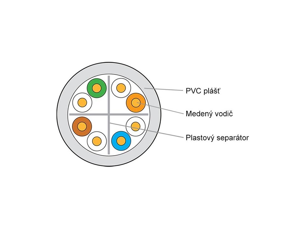 Kábel UTP (U/UTP) 4x2x0,54, Category 6, 400 MHz, Euroclass Eca? - Vyhovuje legislatívnym a technickým podmienkam na protipožiarnu bezpečnosť stavieb a požiadavkám reakcie na oheň platnými v SR a vo všetkých krajinách EU od 1.7.2017, netienený kábel s pármi oddelenými plastovým separátorom a s PVC plášťom, umožňuje prenos všetkých vysokorýchlostných protokolov vrátane 1000BASE-T, testovaný v prenosovom pásme do 400 MHz, nie je chránený tienením voči elektromagnetickému rušeniu