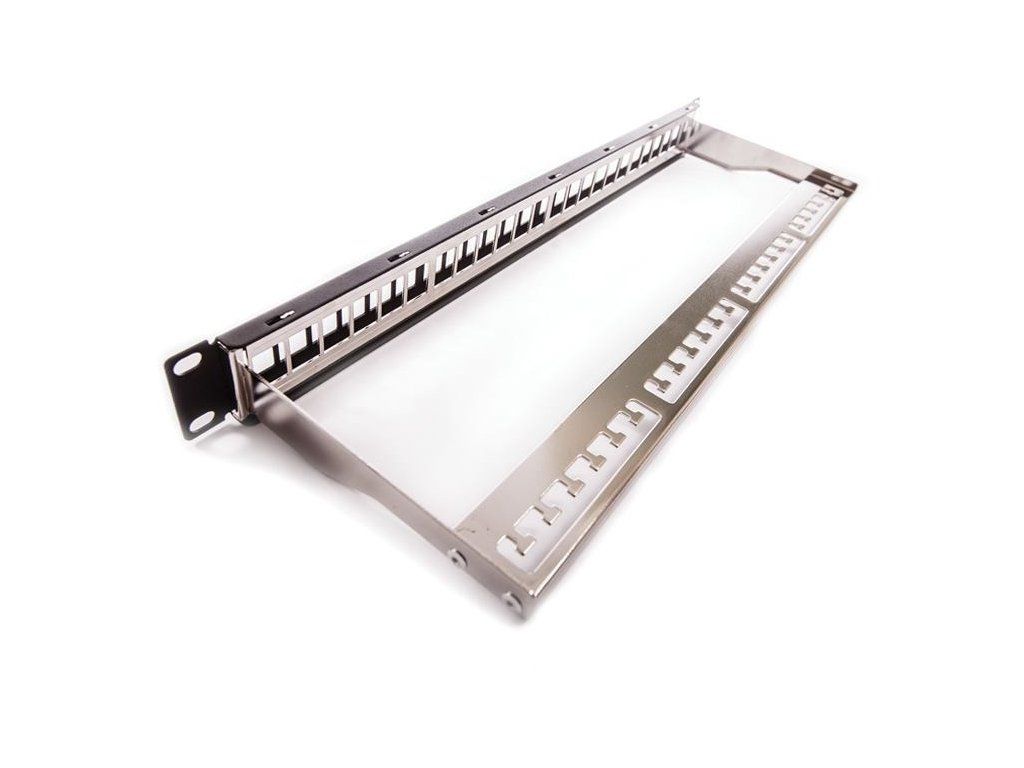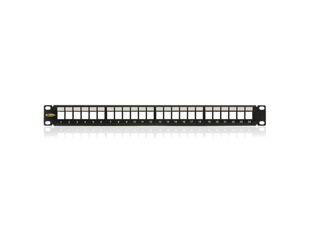 Patch panel pre 24xRJ45, čierny, neosadený - Univerzálny neosadený patch panel veľkosti 1U. Určený pre montáž do 19" rozvádzačov, integrovaný zadný káblový manažment, sťahovacie pásky na uchytenie káblov (24ks), sada skrutiek M6 s plávajúcimi maticami (4ks), uzemňovacia skrutku s podložkou (1ks)