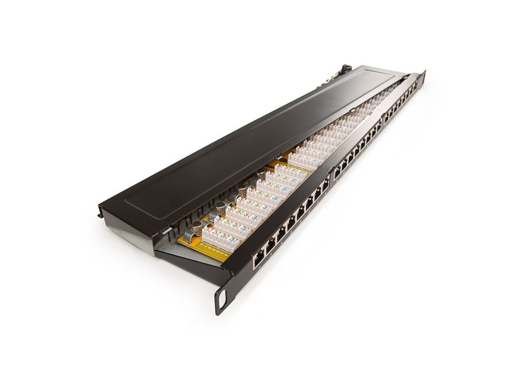 duálny konektorovací blok 110/LSA, rýchla a jednoduchá montáž s použitím 110 alebo Krone narážacieho nástroja, umožňuje prenos všetkých vysokorýchlostných protokolov vrátane 1000BASE-T, zaručuje šírku prenosového pásma 100 MHz, sťahovacie pásky na uchytenie káblov (24 ks), dokonale tienený voči elektromagnetickému rušeniu, určený pre montáž do 19" rozvádzačov, integrovaný zadný káblový manažment