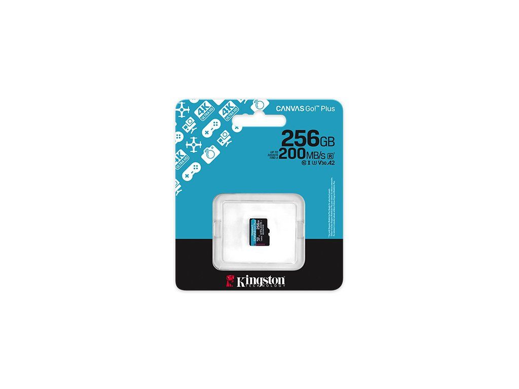 Kingston Canvas Go! Plus 256GB microSD pamäťová karta - U3/V30/A2, rýchlosť čítania 200 MB/s, rýchlosť zápisu 160 MB/s . Vodotesná, nárazuvzdorná, teplotne odolná. Ideálna pre 4K video, smartfóny, akčné kamery, drony. Spoľahlivá pamäťová karta pre náročné multimediálne použitie. Kompatibilná s mikroSDXC zariadeniami, 5-ročná záruka.