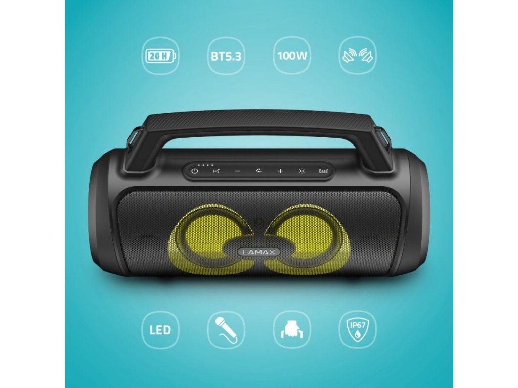 Malé telo s veľkým výkonomRozbehni kdekoľvek aj neplánovanú párty vo veľkom štýle. Prenosný párty reproduktor LAMAX PartyGo1 je vzhľadom malý, ale ukrýva v sebe veľkú silu, výkon 100 W. Technológia BeatBass mu dáva silný, plný a bohatý zvuk. Grilovačku, narodeninovú oslavu alebo menšie párty oživia 3 režimy LED podsvietenia a možnosť pripojenia mikrofónu, keď si chceš užiť karaoke alebo akciu moderovať. Reprak sa automaticky spáruje s akýmkoľvek zariadením prostredníctvom Bluetooth 5.3, ktorý poskytuje bezchybný prenos až na 18 m. Na pohodu s tebou bude nový parťák aj cestovať, batéria mu vydrží až 20 hodín a má navyše šikovné madlo alebo popruh cez rameno. Pripojíš ho ako cez BT, tak USB, microSD, prípadne AUX a vie sa premeniť aj v powerbanku cez USB-A vstup. A keď jeden reprák nestačí, môžeš ho spárovať s druhým.