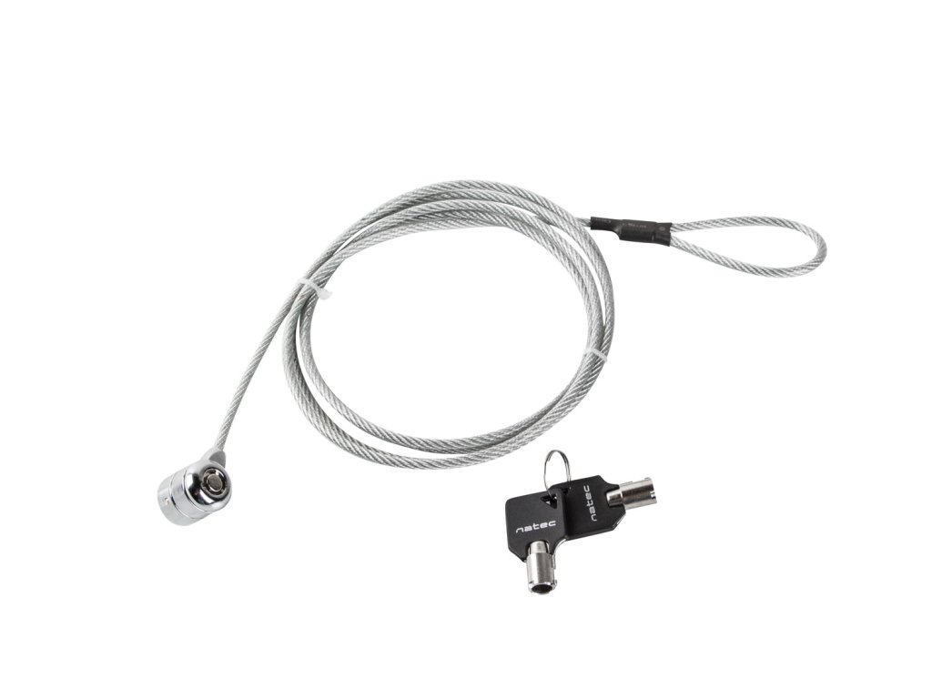 Lankový bezpečnostní zámek na klíč pro notebooky vyrobený z galvanizované oceli, pokrytý gumovou vrstvou, vhodný pro montáž v bezpečnostních slotech notebooků a jiných zařízení např. trezorech, který zvyšuje bezpečnost vašeho zařízení a poskytuje ochranu před odcizením. Typ zámku: Na klíč Barva: Stříbrná Délka kabelu: 1,8m Materiál: ocel, PVC Standard: Kensington lock 3x7mmDodatočné parametre