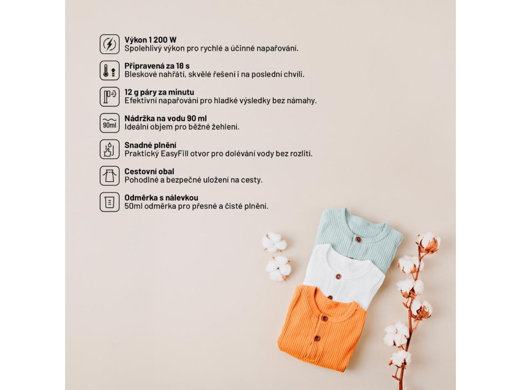 Silný výkon 1 200 W zabezpečí, že para bude nekompromisná voči záhybom, ale šetrná k vášmu oblečeniu. Prístroj je navrhnutý tak, aby zvládol aj hustejšie tkaniny, bez toho, aby ich poškodil. Predhrievanie trvá iba 18 sekúnd, takže napaľovačka je takmer okamžite pripravená. Rýchly štart oceníte najmä v zhone, napríklad pred dôležitým pracovným stretnutím alebo večernou udalosťou. Parný výkon dosahuje až 12 gramov pary za minútu, čo je dostatočné množstvo na efektívne a rovnomerné napaľovanie. Para preniká hlboko do tkaniny, takže oblečenie nielen vyhladíte, ale aj osviežite.