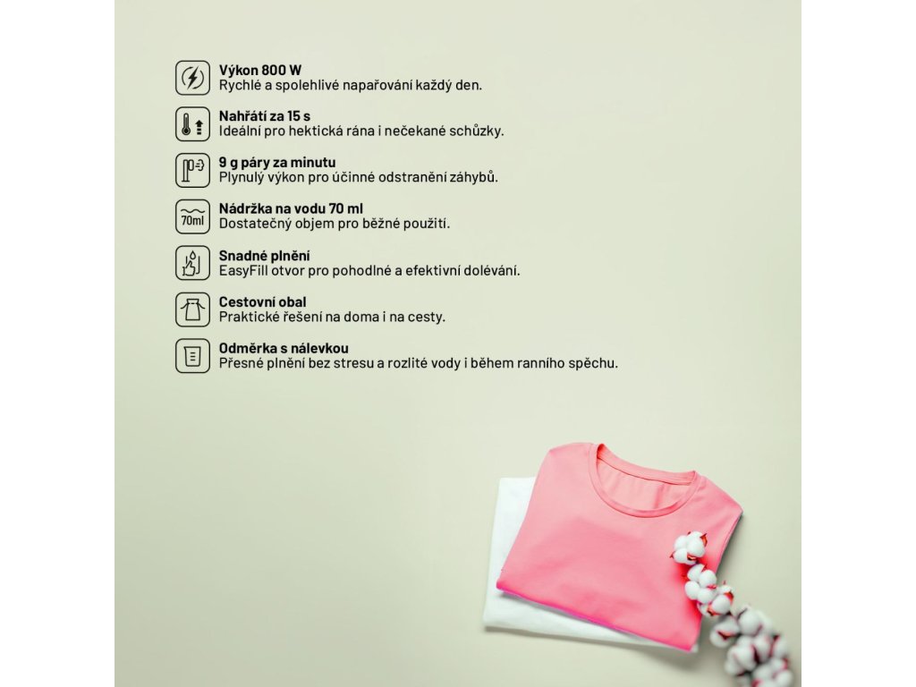 Nádobka o objeme 70 ml vám umožní žehliť dlhšie bez nutnosti častého dolievania vody. A aj keď voda dojde, vďaka praktickému otvoru EasyFill a 50 ml odmerke s nálevkou je doplnenie rýchle a bez starostí. Už žiadne rozlievanie ani zložité otváranie – len maximálny komfort pri každom použití.