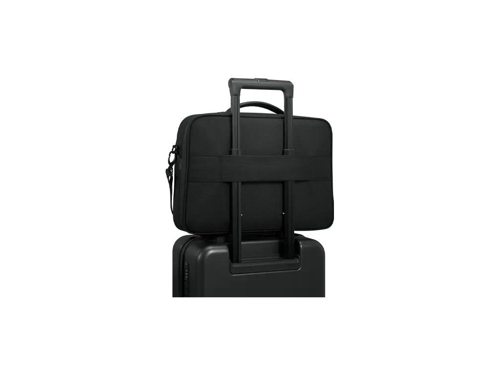 Main compartment features a full workstation and storage pockets for accessories and other small items, including RFID blocking pocket and key fob