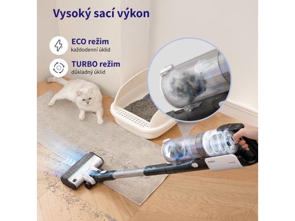 Vysavač nabízí dva sací režimy. ECO slouží pro běžný, každodenní úklid. TURBO mód je tu pak pro silné znečištění a důkladný úklid.