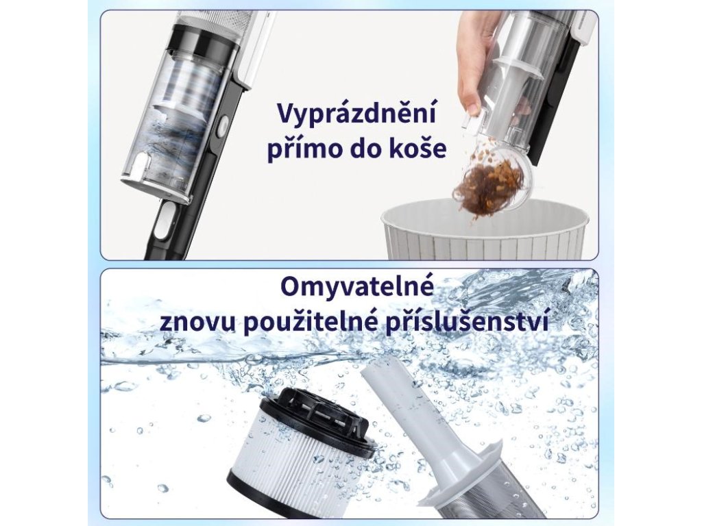 LVAC200 můžete stiskem jednoho tlačítka vyprázdnit přímo do koše. Jeho filtry a kartáče jsou navíc omyvatelné. Hygiena zaručena.