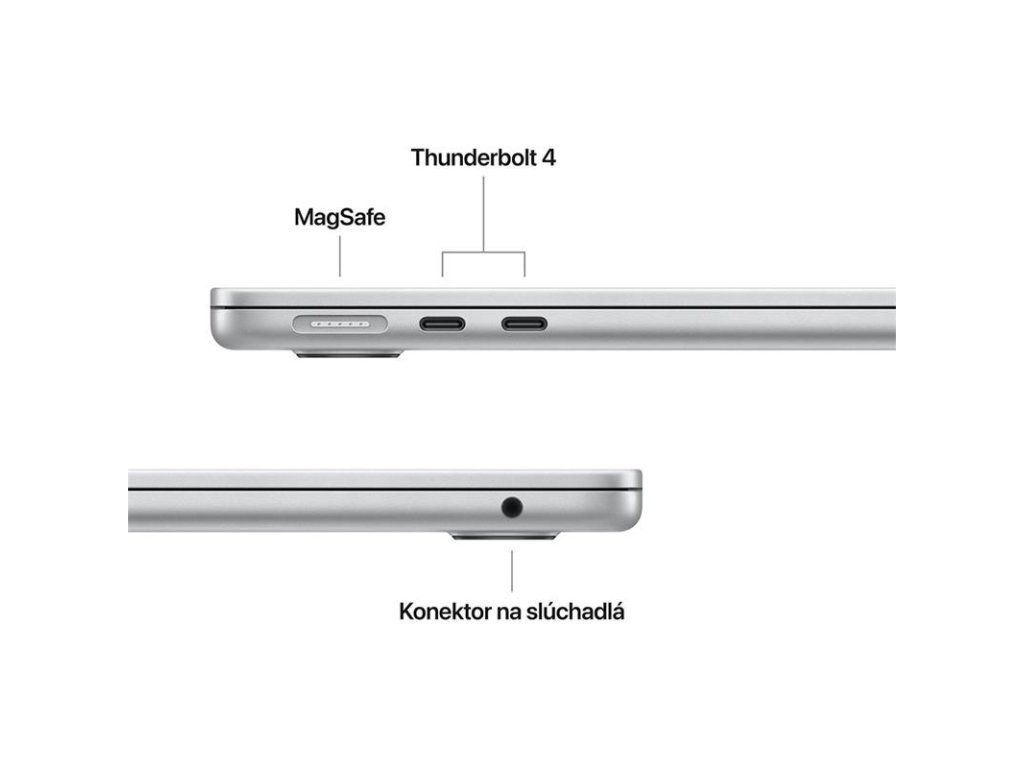 PRIPOJ SI VŠETKO – MacBook Air má dva porty Thunderbolt 4, nabíjací port MagSafe, konektor na slúchadlá, Wi-Fi 6E a Bluetooth 5.3.3 A podporuje až dva externé displeje.
