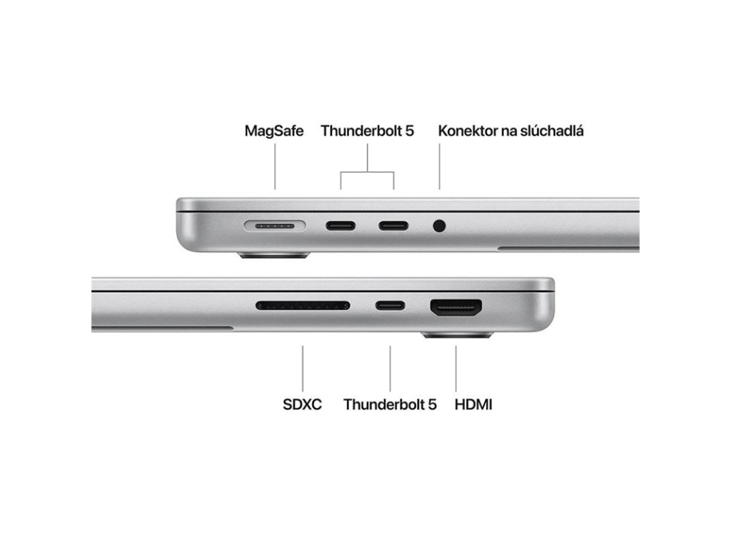 PRIPOJ SI VŠETKO – 14-palcový MacBook Pro má tri porty Thunderbolt 5, nabíjací port MagSafe 3, slot na kartu SDXC, port HDMI a konektor na slúchadlá. A podporuje až dva externé displeje s čipom M4 Pro alebo až štyri s čipom M4 Max.