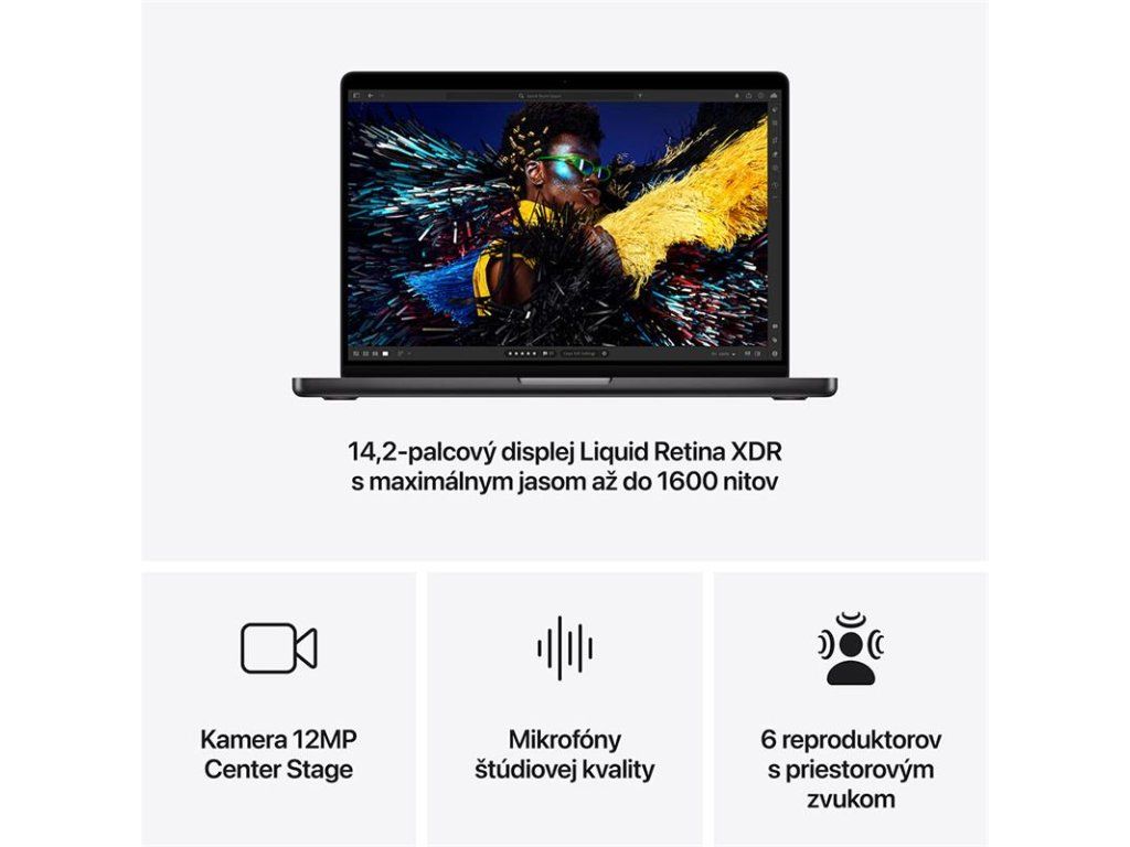 BRILANTNÝ PROFESIONÁLNY DISPLEJ – 14,2-palcový displej Liquid Retina XDR4 má maximálny jas 1 600 nitov, ustálený jas až do 1000 nitov a kontrast 1 000 000 : 1.
