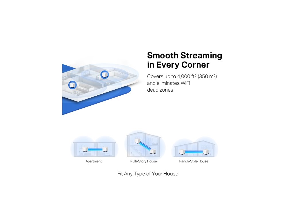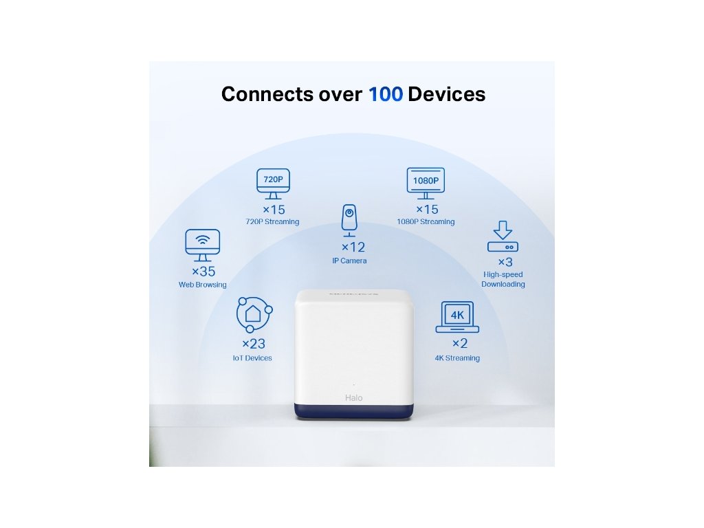 Halo funguje ako unifikovaný systém, ktorý poskytuje dostatočné pokrytie signálom Wi-Fi v každej časti vášho domova. Mercusys Mesh Technology poskytuje neuveriteľne rýchly a stabilný zážitok z používania, keď chodíte po dome. Pokrytie až 550 m2 s vysokorýchlostným WiFi, ktorá eliminuje mŕtve zóny WiFi vo vašom dome. Halo H50G poskytuje rýchle a stabilné pripojenie pre viac ako 100 zariadení s rýchlosťami až 1 900 Mb / sa pracuje s hlavnými poskytovateľmi internetových služieb (ISP) a modemy. 3x gigabitové porty na jednotku Halo pre bleskovo rýchle káblové pripojenie. Sada 2 kusov