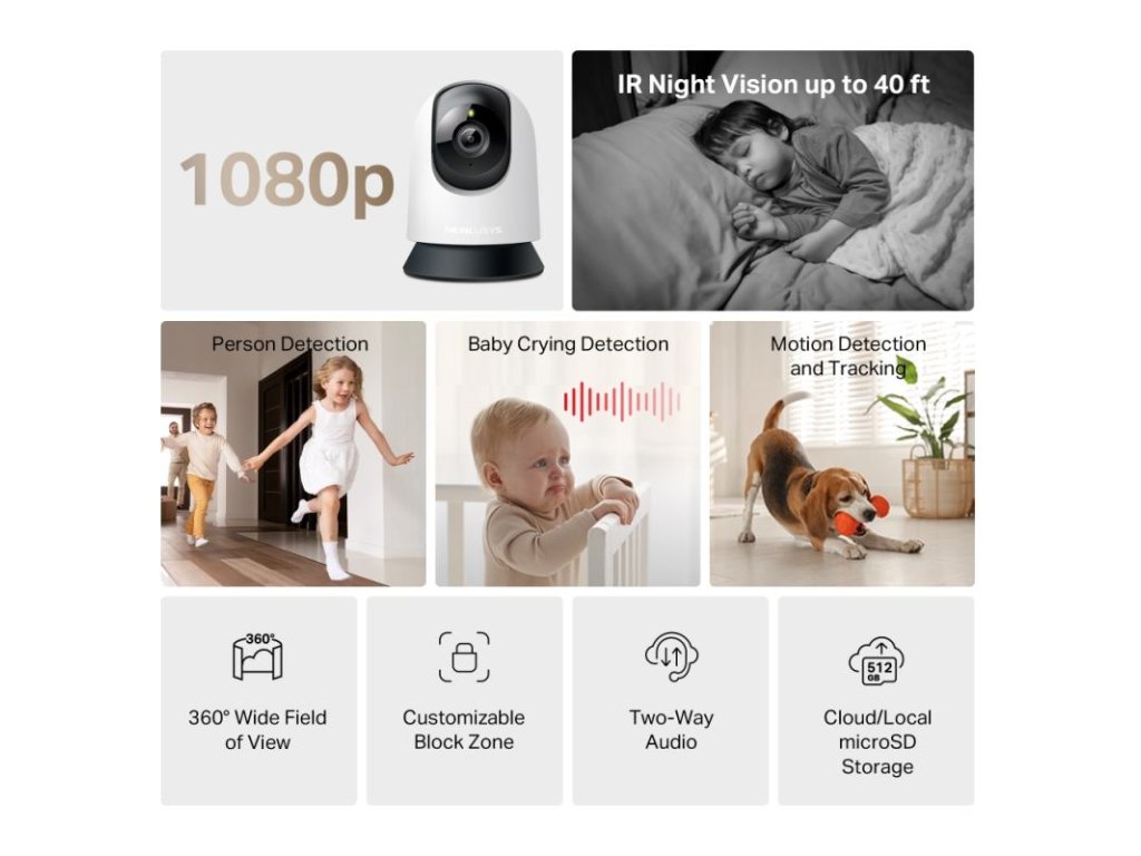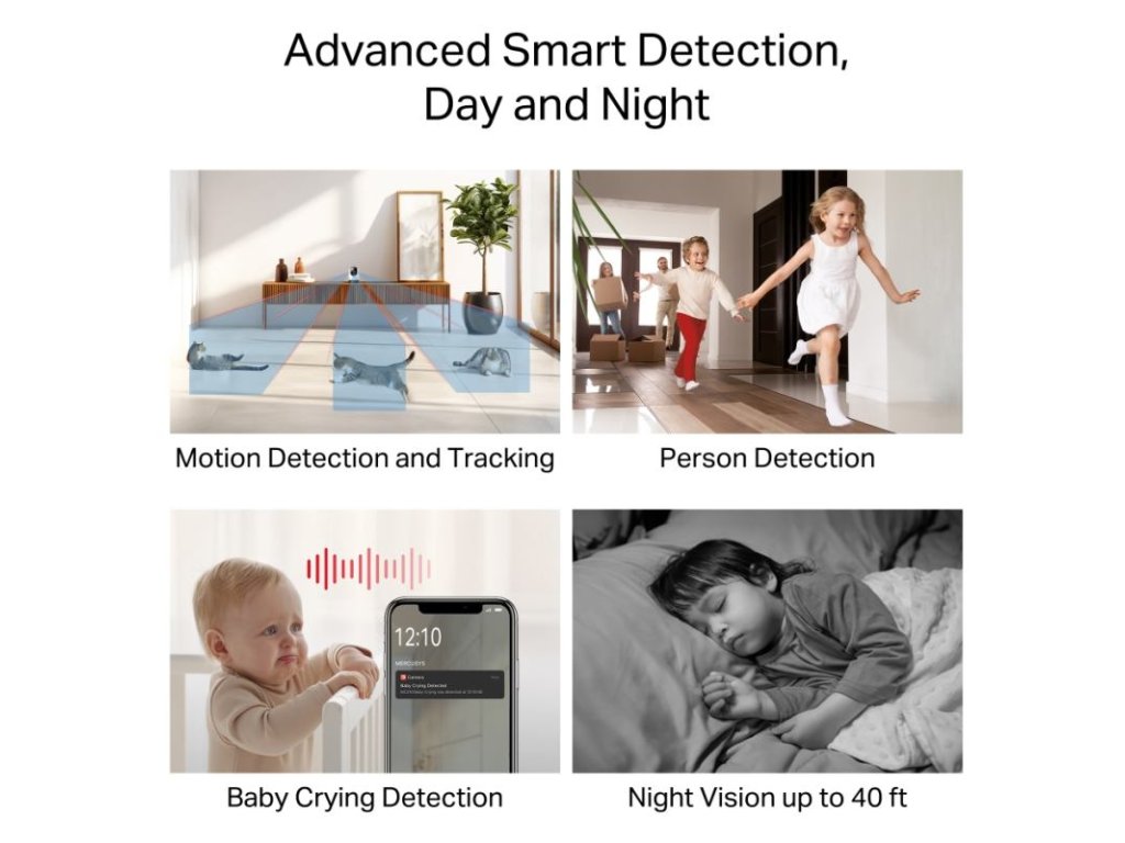 Inteligentná detekcia - Nepretržite sleduje pohyb 24/7 a udržuje objekty v zornom poli, aj v úplnej tme vďaka nočnému videniu. Okamžité upozornenia na detekovaný pohyb, osoby alebo plač dieťaťa.