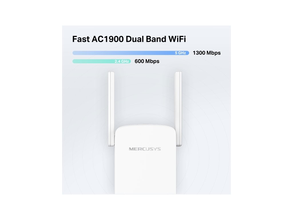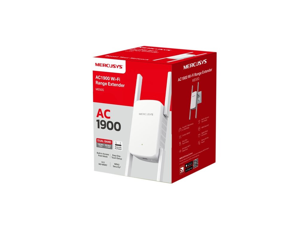 ME50G AC1900 Wi-Fi Range Extender - Dvojpásmové rýchlosti až 1900 Mbps 1300 Mbps na 5 GHz a 600 Mbps na 2,4 GHz. Gigabitové káblové pripojenie Poskytuje rýchle káblové pripojenie pre PCS, IPTVS.a herné konzoly. 3×3 MU-MIMO Pripojte viac zariadení súčasne. Funguje s akýmikoľvek smerovačmi na rozšírenie WiFi tam, kde to najviac potrebujete. Jednoduché nastavenie jedným dotykom Stlačením tlačidla WPS rozšírite pokrytie Wi-Fi v priebehu niekoľkých sekúnd. Zabudovaný režim prístupového bodu. Funguje ako režim RE a režim AP. Spravujte svoju sieť pomocou aplikácie nastavte si ju v priebehu niekoľkých minút a spravujte svoje Wi-Fi doma alebo vonku prostredníctvom zariadení so systémom iOS alebo Android
