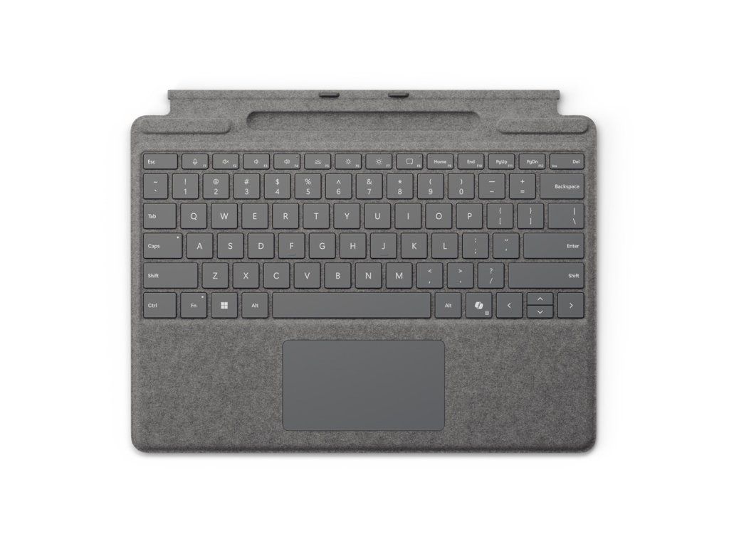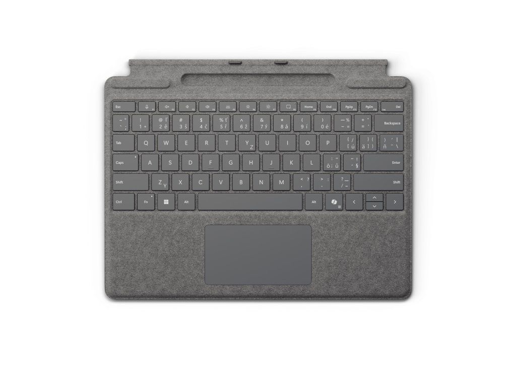 klávesnice Surface Pro se slotem pro pero Posuňte všestrannost na novou úroveň s perfektní prémiovou klávesnicí s mechanickými a podsvícenými klávesami, která nabízí skleněný touchpad a zbrusu novou klávesu Copilot, abyste měli AI na dosah ruky. Díky integrovanému slotu Pero Surface Slim Pen máte zajištěné bezpečné a snadné dobíjení. Rozměry: 289,1 × 226,1 × 4,89 mm Hmotnost: 281 g Rozhraní: magnetické Senzory: akcelerometr Materiál: Alcantara® Barva: platinová Klávesy: * aktivace pohybem (mechanických) kláves * CZ&SK layout, QWERTZ, celý řádek funkčních kláves (F1–F12) * vyhrazené klávesy pro Copilot, ztišení mikrofonu, vystřihování, zkratky Windows, ovládání médií a jasu obrazovky * pravé tlačítko myši Kompatibilita: * Surface Pro (11. edice) * Surface Pro 10 pro firmy * Surface Pro 9 * Surface Pro 8 Obsah balení: * Surface Pro se slotem pro pero * spouštěcí karta/průvodce zárukouDodatočné parametre