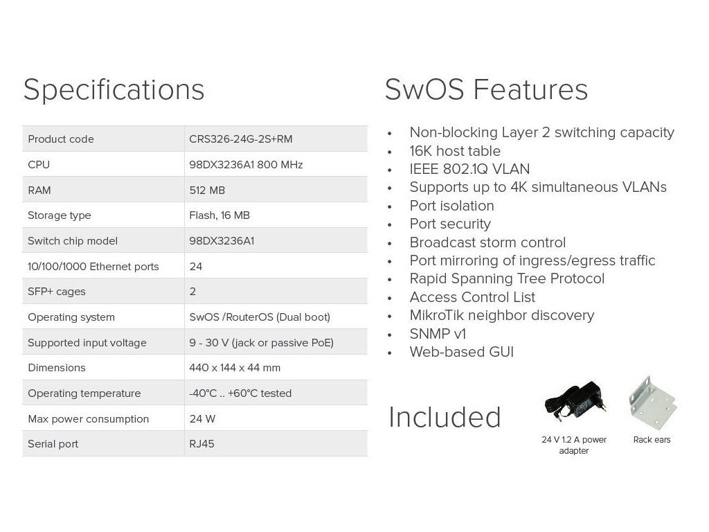 Systémové řešení platforem firmy MikroTik pro poskytovatele bezdrátového připojení k síti Internet. Cloud Router Switch 326-24G-2S+RM je operačním systémem SwOS či RouterOS poháněný 24-portový Gigabitový Ethernet switch s dvěma SFP+ šachtami v 1U rack provedení. Upgradovaná verze modelu CSS326-24G-2S+RM umožňuje díky přidanému procesoru a ''Dual boot'' funkci volbu operačního systému SwOS/RouterOS. Získáváte tak aktivní prvek se základními funkcemi řiditelného switche s dalšími přidanými funkcemi, např. • port-to-port forwarding management • MAC filter • VLANs configuration • mirror traffic • bandwidth limitation • MAC and IP header fields adjustment SwOS je konfiguratelné z webového prohlížeče, vedle bežných funkcí řiditelných switchů umožňuje například • port-to-port forwarding management • apply MAC filter • configure VLANs • mirror traffic • apply bandwidth limitation • adjust some MAC and IP header fields SFP šachty podporují jak 1.25 Gb SFP moduly tak 10 Gb SFP+ moduly. Technické specifikace: Product code: CRS326-24G-2S+RM CPU: 98DX3236A1 800 MHz RAM: 512 MB Storage type: Flash, 16 MB Switch chip model: 98DX3236A1 10/100/1000 Ethernet ports: 24 SFP+ cages: 2 Operating system: SwOS /RouterOS (Dual boot) Supported input voltage: 9 - 30 V (jack or passive PoE) Dimensions: 440 x 144 x 44 mm Operating temperature: -40°C .. +60°C tested Max power consumption: 24 W Serial port: RJ45 Upozornění: Výrobce MIKROTIK nevztahuje záruku na zařízení poškozená přepětím. Zařízení je třeba na vstupech adekvátně chránit proti indukovanému elektrostatickému přepětí či přepěťovým špičkám na silovém vedení. Při venkovních instalacích je třeba používat stíněnou kabeláž (FTP/SFTP), příslušné přepěťové ochrany (pokud nejsou integrovány) a provést korektní a efektivní uzemnění.Dodatočné parametre