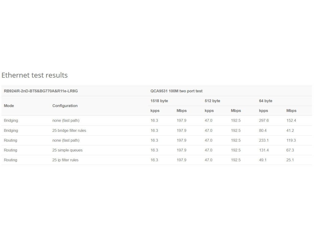 HARDWARE Architektura: MIPSBE CPU: QCA9531 (1 jádro, 650 MHz) RAM: 64 MB Úložiště: 128 MB NAND RouterOS licence: L4 Operační systém: RouterOS v7 Střední doba mezi poruchami: ~200 000 h při 25 °C Provozní teplota: -40 °C až 70 °C NAPÁJENÍ DC vstupy: 3 (DC jack, PoE-IN, MicroUSB) Napětí vstupu DC jack: 12–57 V Napětí vstupu PoE: 18–57 V PoE-in: 802.3af/at Napájení přes microUSB: 5 V Max. spotřeba: 23 W Spotřeba bez příslušenství: 6 W Chlazení: Pasivní POE-OUT PoE-out porty: Ether2 Typ PoE-out: Pasivní PoE Max. výstup (18–30 V): 650 mA Max. výstup (30–57 V): 450 mA Celkový výstupní výkon: 12 W WIRELESS (2.4 GHz) Max. rychlost: 300 Mbit/s Počet řetězců: 2 Standardy: 802.11b/g/n Zisk antény: 1.5 dBi Chipset: QCA9531 Generace: Wi-Fi 4 Přenos / Citlivost:* 1 MBit/s: 22 dBm / -96 dBm * 11 MBit/s: 22 dBm / -89 dBm * 6 MBit/s: 20 dBm / -93 dBm * 54 MBit/s: 18 dBm / -74 dBm * MCS0: 20 dBm / -93 dBm * MCS7: 16 dBm / -71 dBm ETHERNET 10/100 Mbps porty: 2 PERIFERIE SIM sloty: 1x Nano SIM MiniPCI-e sloty: 1 USB porty: 1 (microUSB type AB) Max. USB proud: 1 A Serial port: RS485 DALŠÍ FUNKCE Monitor teploty PCB: Ano Monitor napětí: Ano Bluetooth verze: 5.2 Bluetooth konektor: uUFL GPS konektor: SMA CERTIFIKACE Certifikace: CE, EAC, ROHS IP krytí: IP20