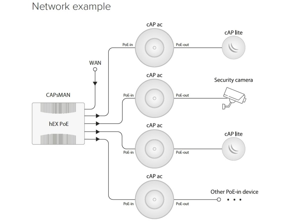 Popis produktu RBcAPGi-5acD2nD / cAP ac (stropní Access Point) je stropní dual band AP od MikroTiku s modulačními rychlostmi 300 Mbps (2.4GHz) a 866Mbps (5GHz). Navrženo bylo tak, aby maximálně splynulo s místem instalace, ideální pro hostinské činnosti, jako restaurace, hotely, letiště, nákupní centra, atd... cAP ac podporuje 802.11a/b/g/n/ac a může být napájeno pomocí pasivního PoE. Je to ideální zařízení pro MikroTik CAPsMAN (řízený správce AP systému), který umožňuje ovládat všechna AP zařízení z jednoho centrálního místa. Narozdíl od tradičního řídicího softwaru, který vyžaduje samostatné PC, CAPsMAN běží na existujícím RouterBOARD zařízení ve vaší síti! PoE Out Oproti ostatním cAP jednotkám má tento model 2 ethernetové porty s podporou PoE. PoE IN na prvním portu podporuje napájení jak pomocí aktivních norem 802.3af/at, tak i pasivního napájení 17 až 57V DC. Druhý port s funkcí PoE Out může napájet další zařízení se stejným napětím jako na prvním portu, ovšem pouze pomocí pasivního PoE. Obsah balení Zařízení Napájecí adaptér 24V/1.2A Gigabitový PoE injektor Montážní sada k přichycení na strop/zeď Technické parametry Bezdrátové vlastnosti Vysílací výkon [dBm]:26 Bezdrátové frekvence:2.4 + 5 GHz (dual band) WiFi standardy:802.11ac, 802.11n, 802.11a, 802.11b/g Přenosová rychlost - 5GHz [Mb/s]:866 Přenosová rychlost - 2.4GHz [Mb/s]:300 2.4GHz MIMO:2 x 2 5GHz MIMO:2 x 2 Typ antény:Vestavěná Zisk antény [dBi]:2,5 Konektory a rozhraní Rychlost LAN:(2) 10/100/1000Mbps Gigabit LAN:Ano Napájení Napájení přes PoE:802.3af, 802.3at, 17 .. 57V DC Typ napájení:PoE Typy PoE:PoE-Out + PoE-In Počet PoE Out portů:1 Max. spotřeba energie [W]:13 Fyzické charakteristiky Provedení:Na zeď Provozní teplota [°C]:-40 až 70 Šířka [mm]:136 Výška [mm]:30 Hloubka [mm]:136 Hardware CPU:IPQ-4018 Počet CPU jader:4 Interní uložiště [MB]:16 RAM [MB]:128 Software Operační systém:RouterOS - L4 Výchozí IP adresa:192.168.88.1 Výchozí jméno a heslo:admin / -Dodatočné parametre