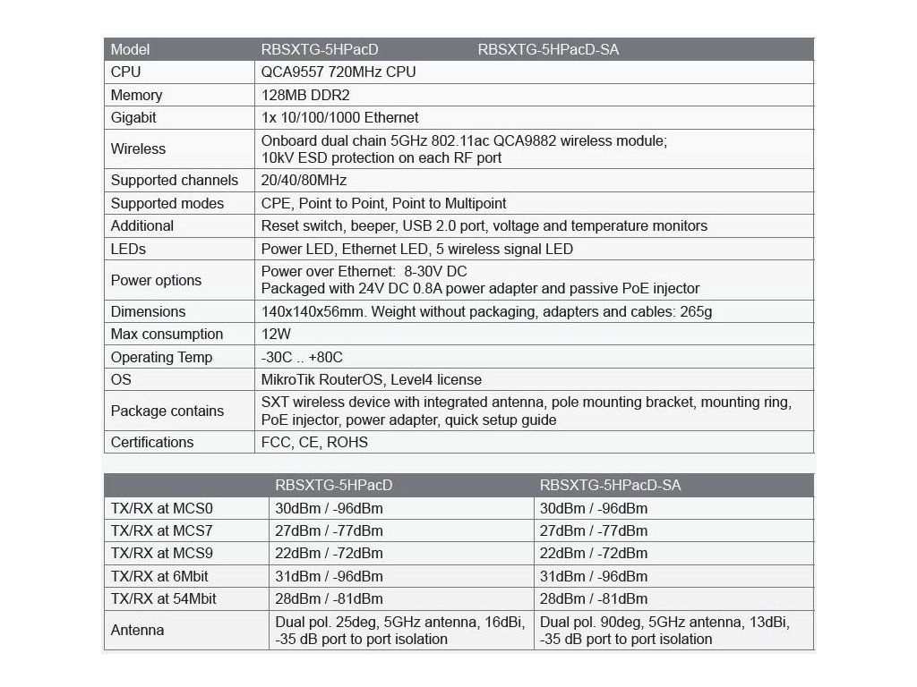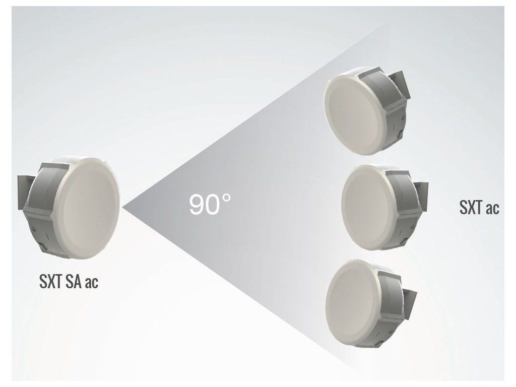 Mikrotik RBSXTG-5HPacD-SA, 13dBi, L4,high power,AC, sektorový AP Přehled * Systémové řešení platforem firmy MikroTik pro poskytovatele bezdrátového připojení k síti Internet. * RouterBoard s integrovaným 802.11ac modulem ve vodotěsném UV odolném boxu s integrovanou sektorovou MIMO anténou o zisku 13dBi a vyzařovacím úhlu 90°,. * Aktivní prvky standardu 802.11ac umožňují dosažení až 540Mbit reálné přenosové rychlosti (866Mbit datarate). * Jsou podporovány 20/40/80MHz kanály a 256-QAM modulace. * Zařízení podporuje client mode (CPE), point-to-point a point to multipoint (AP) mody a je zpětně kompatibilní s 802.11an prvky. * Zvýšený rozsah pracovních teplot! (-30°,C až +80°,C) Specifikace * osazena Gigabit Ethernet portem * založena na 720MHz CPU * disponuje pamětí 128MB RAM * integrovaný dual chain 5Ghz high gain 1300mW 802.11ac modul * předinstalovaná aktivovaná RouterOS L4 licence Součástí dodávky * 1x outdoor jednotka RBSXTG-5HnD * 1x montážní příprava k uchycení jednotky na stožár/konzoli * 1x napájecí zdroj * 1x POE injector CPU * QCA9557 720MHz CPU Memory * 128MB DDR2 LAN * Gigabit 1x 10/100/1000 Ethernet Wireless * Onboard dual chain 5GHz 802.11ac QCA9882 wireless module ESD protection * 10kV ESD protection on each RF port Supported channels * 20/40/80MHz Supported modes * Point to Point, Point to Multipoint Additional * Reset switch, beeper, USB 2.0 port, voltage and temperature monitors LEDs * Power LED, Ethernet LED, 5 wireless signal LED Power options Power over Ethernet * 8-30V DC Power supply * 24V DC 0.8A power adapter and passive PoE injector Dimensions * 140x140x56mm Weight (without packaging, adapters and cables) * 265g Max consumption * 12W Operating Temp * -30C .. +80C OS * MikroTik RouterOS, Level4 license Package contains * SXT wireless device with integrated antenna, pole mounting bracket, mounting ring, PoE injector, power adapter, quick setup guide Certifications * FCC, CE, ROHS ! UPOZORNĚNÍ ! Výrobce Mikrotik neposkytuje záruku na zařízení poškozená přepětím. Zařízení je třeba adekvátně chránit proti indukovanému elektrostatickému přepětí či přepěťovým špičkám na silovém vedení. Pro venkovní instalace používat výhradně stíněnou kabeláž (FTP/SFTP) a jednotky korektně uzemnit (prostřednictvím integrovaného zemnícího členu či použitím ethernetové přepěťové ochrany).Dodatočné parametre