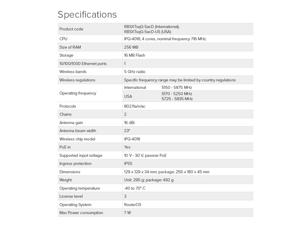 Systémové řešení platforem firmy MikroTik pro poskytovatele bezdrátového připojení k síti Internet. Klientská jednotka vyznačující se extra příznivou cenou, nenápadným designem s kompaktními rozměry (13x13cm) a vysokou štíhlostí. Outdoor jednotka s integrovaným 5GHz 802.11ac radiovým modulem a včetně systému RouterOS Mikrotik V6 L3. Integrováno ve vodotěsném, UV odolném boxu s integrovanou duální 5 GHz anténou o zisku 16 dBi. Bezdrátový modul je vybaven přepěťovou ochranou 10 kV. Set je vhodný pro efektivní připojení klientů až na vzdálenost 1 km. Součástí dodávky je napájecí zdroj 24V 0,3A včetně PoE. Technické specifikace: Product code: RBSXTsqG-5acD CPU: IPQ-4018, 4 cores, nominal frequency 716 MHz Size of RAM: 256 MB Storage :16 MB Flash 10/100/1000 Ethernet ports: 1 Wireless bands: 5 GHz radio Operating frequency: 5150 - 5875 MHz Protocols: 802.11a/n/ac Chains: 2 Antenna gain: 16 dBi Antenna beam width: 23° Wireless chip model: IPQ-4018 PoE in: Yes Supported input voltage: 10 V - 30 V, passive PoE Ingress protection: IP55 Dimensions: 129 x 129 x 34 mm, package: 255 x 180 x 45 mm Weight Unit: 295 g, package: 492 g Operating temperature: -40 to 70° C License level: 3 Operating System: RouterOS Max Power consumption: 7 W Upozornění Výrobce Mikrotik neposkytuje záruku na zařízení poškozená přepětím. Zařízení je třeba adekvátně chránit proti indukovanému elektrostatickému přepětí či přepěťovým špičkám na silovém vedení. Pro venkovní instalace používat výhradně stíněnou kabeláž (FTP/SFTP) a jednotky korektně uzemnit (prostřednictvím integrovaného zemnícího členu či použitím ethernetové přepěťové ochrany).Dodatočné parametre