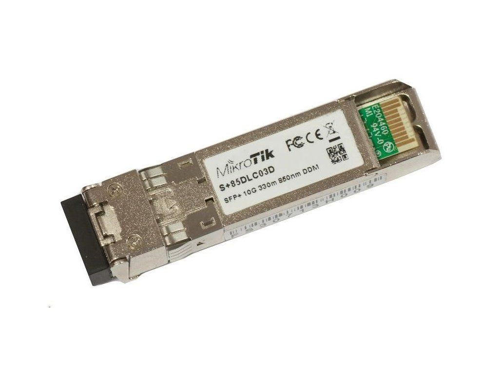 S+85DLC03D je 10Gb/s modul SFP+ s konektorom LC, pracuje s vlnovými dĺžkami 850 nm, je určený pre viacmódové vlákna (MM), použitie do 300 m. Moduly sú testované a výrobca zaručuje úplnú kompatibilitu s produktmi CCR1036-8G-2S+ a CCR1036-8G-2S+EM. Moduly sú kompatibilné aj s produktmi iných výrobcov.