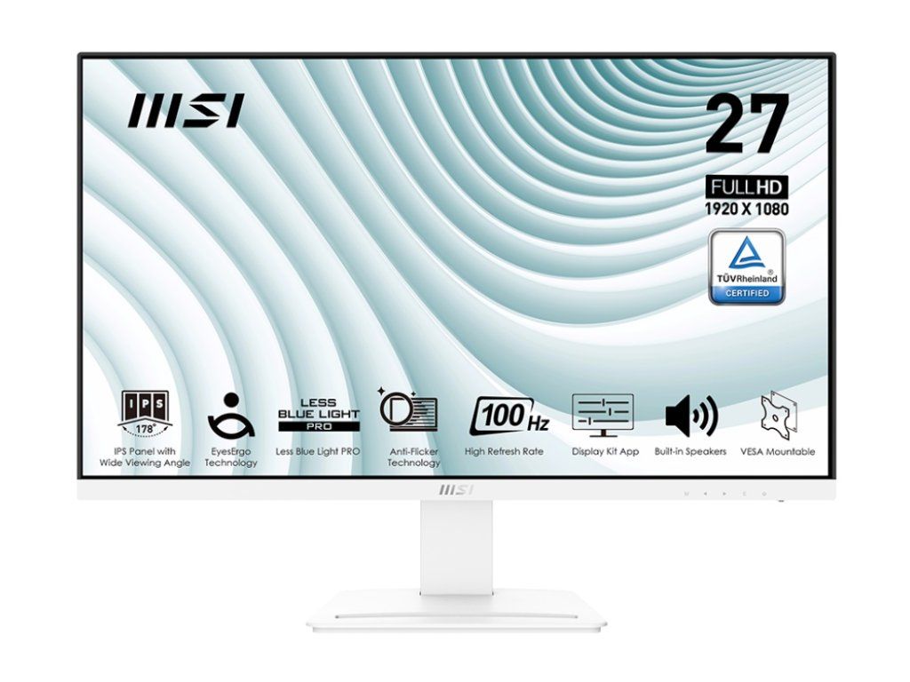 MSI PRO MP273AW * IPS Grade Panel * Anti-Flicker technology * Less Blue Light * Anti-Glare Display Design * 100Hz High Refresh Rate * Display Kit Support * Built-In Speaker * VESA Mountable * Accessory Slot Design Úhlopříčka: 27'' Zakřivení: ne Typ obrazovky: IPS Rozlišení: 1920 x 1080 (FHD) Rozteč pixelů: 0.3114(H) x 0.3114(V) Poměr stran: 16:9 Kontrast: 1000:1 Odezva: 1ms (MPRT) / 4ms (GTG) Obnovovací frekvence: 100Hz Pozorovací úhly (horizontální/vertikální): 178°/178° Povrch displeje: antireflexní Počet barev: 16.7M, 8 bits ( 6 bits + FRC ) Audio: 2x 3W Porty: * 1x DisplayPort (1.2a) * 1x HDMI™ (1.4b) * 1x D-Sub (VGA) * 1x Kensington Lock Napájení: externí adaptér (12V 2.5A) Montáž na zeď: VESA 75x75mm Naklápění monitoru: * naklonění: -5° ~ 20° * nastavení výšky: ne Barva: bílá Rozměry: 613.50 x 462.60 x 182 mm Hmotnost: 3,9kg Záruka: 2 rokyDodatočné parametre