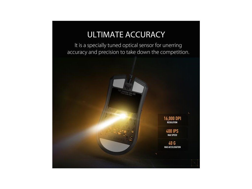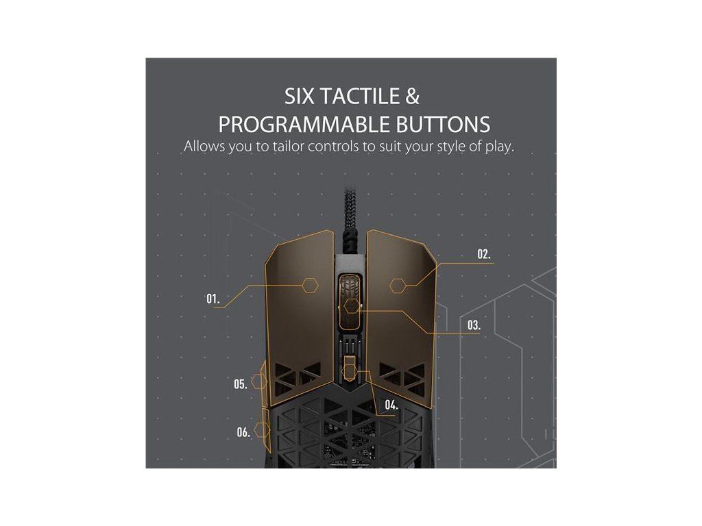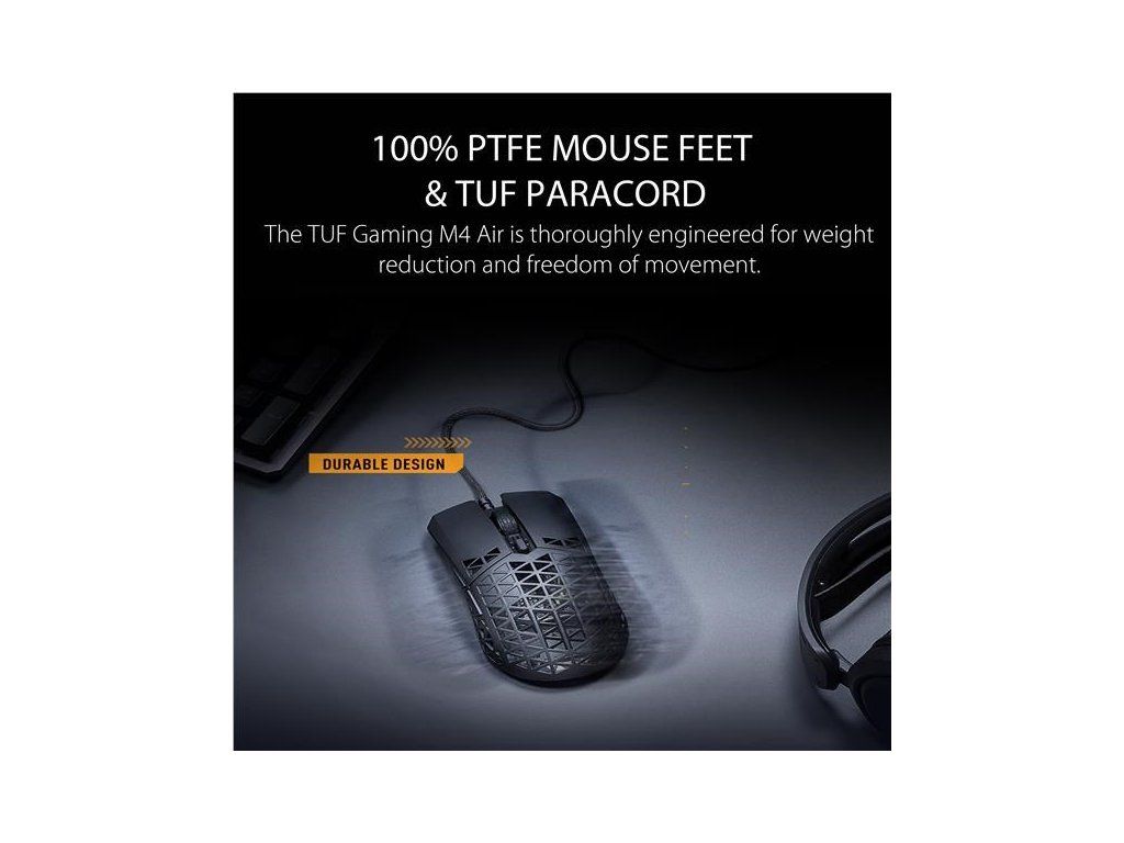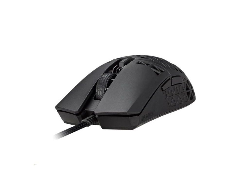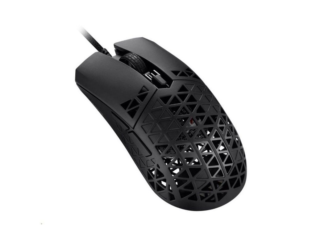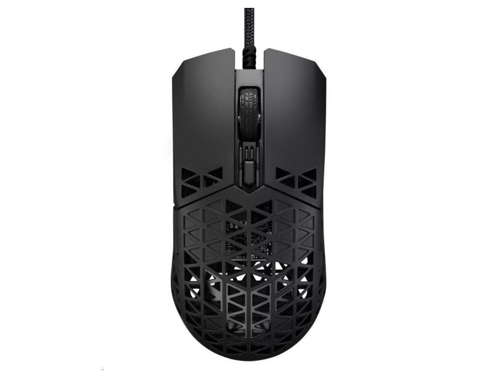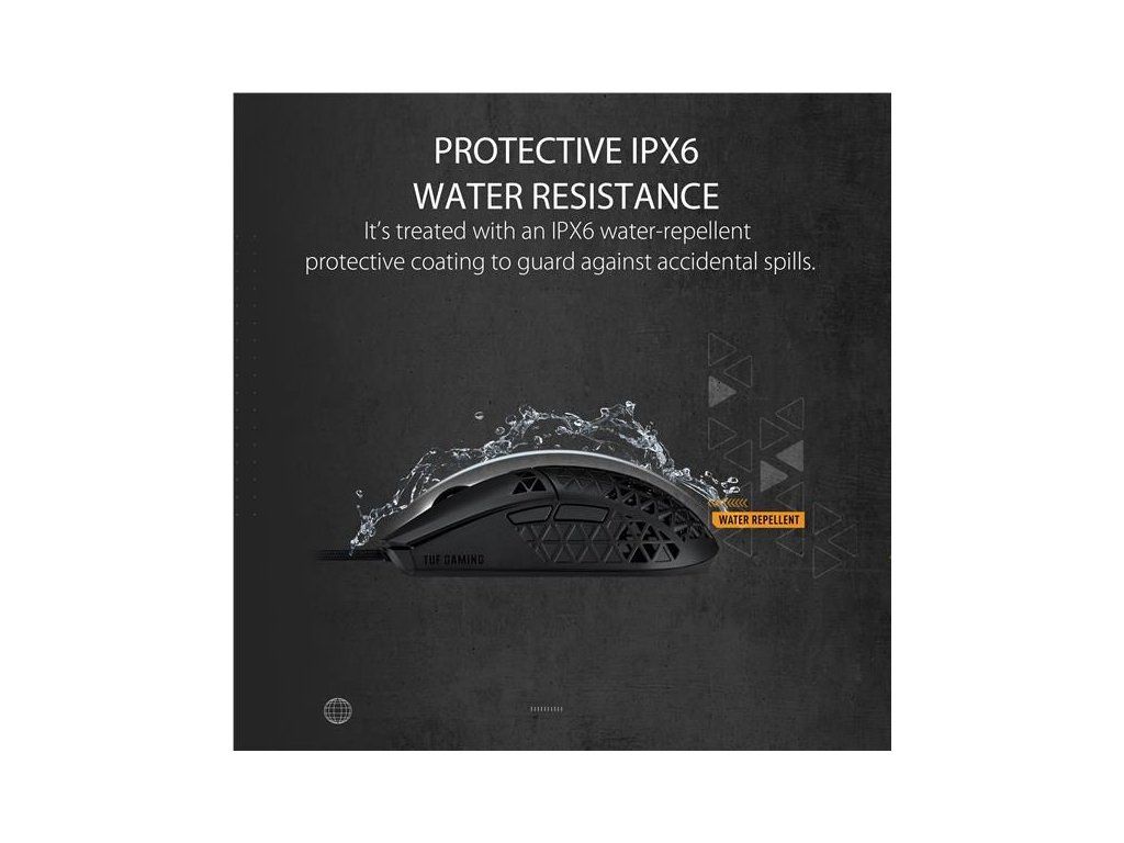 Ľahká drôtová herná myš so snímačom s rozlíšením 16 000 dpi, šiestimi programovateľnými tlačidlami, ultraľahkým plášťom Air Shell, odolnosťou voči vode IPX6, antibakteriálnou ochranou ASUS, šnúrkou TUF Gaming Paracord a čistými PTFE nožičkami