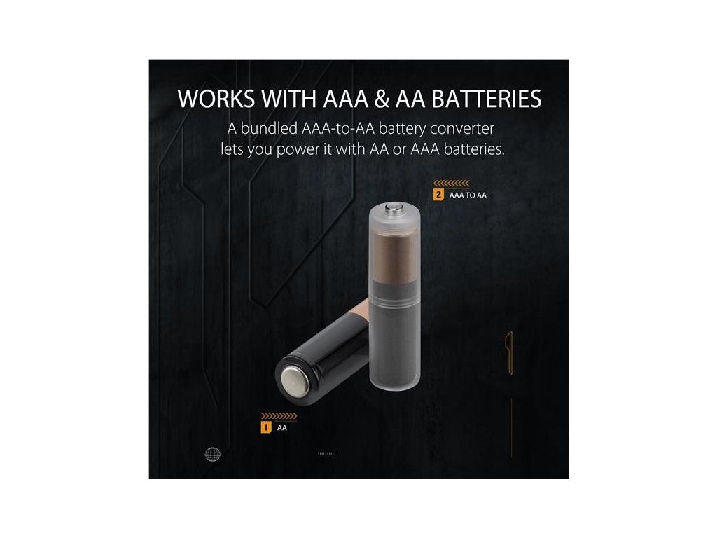 - Funguje s batériami AA alebo AAA prostredníctvom pribaleného držiaka konvertora batérií, ktorý znižuje hmotnosť o 10 %