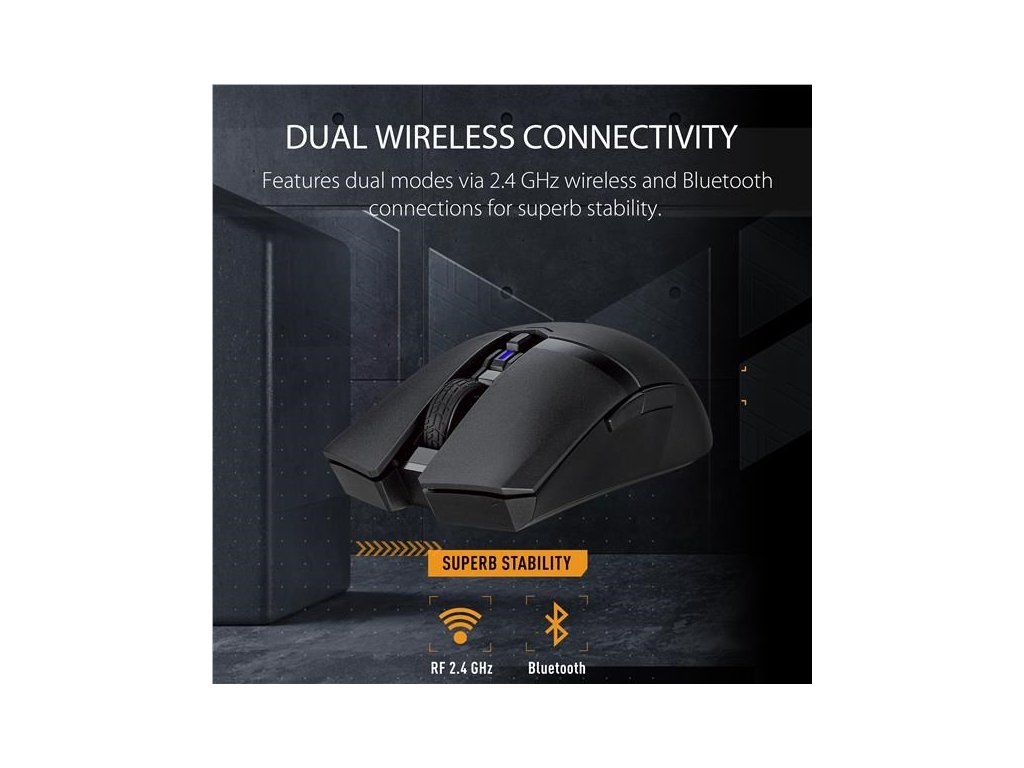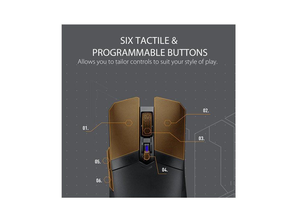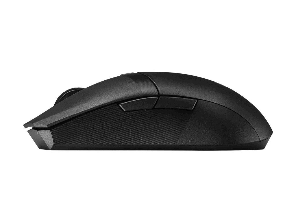 Ľahká obojručná herná myš s dvoma bezdrôtovými režimami, snímačom s rozlíšením 12 000 dpi, šiestimi programovateľnými tlačidlami, vrchným krytom PBT s antibakteriálnou ochranou ASUS, 100 % PTFE nožičkami a puzdrom Armoury Crate.
