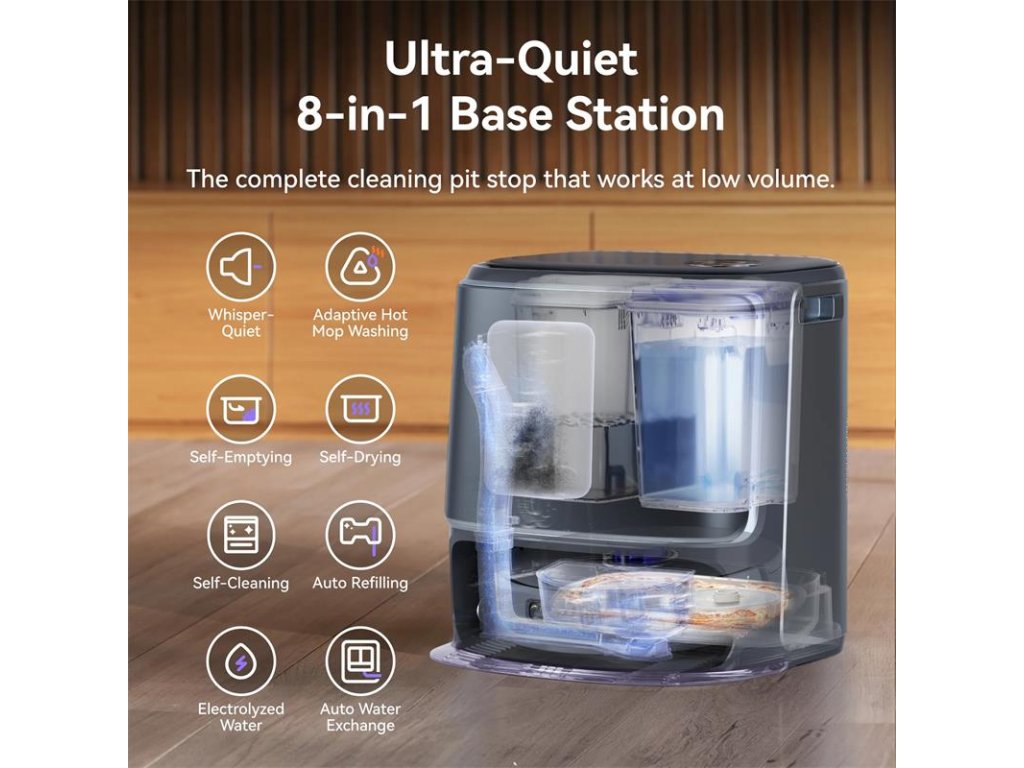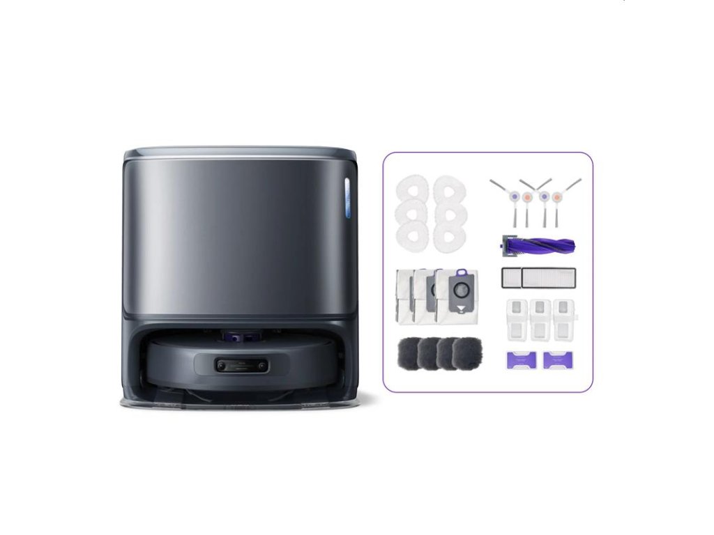 Tiež súčasťou balenia : Napájací kábel základňovej stanice*1, Predlžovacia rampa*1, Filter nádoby na prach*1, Modul na čistenie základnej dosky*1, Vymeniteľná vložka kôš*1, Produktová príručka*1.
