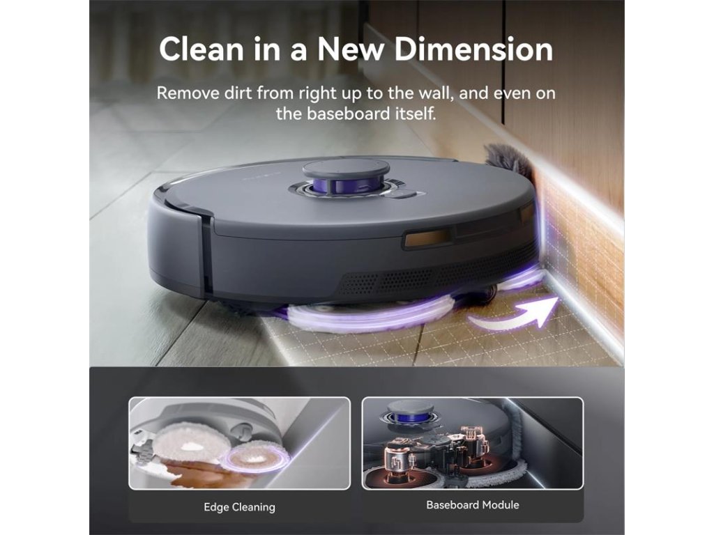 Technológia EdgeSwing zaisťuje čistenie podláh až po steny, zatiaľ čo modul základnej dosky čistí vertikálne povrchy.