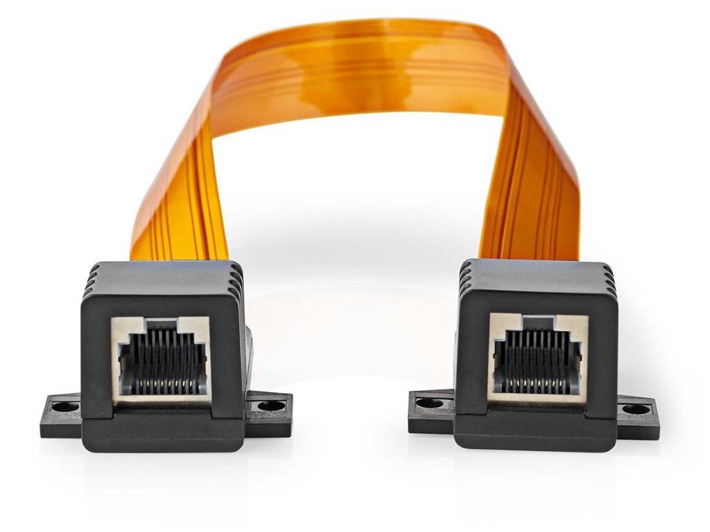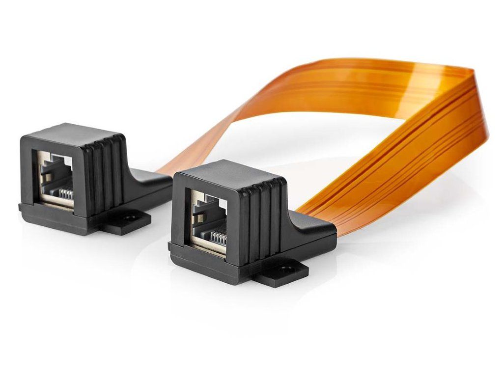 Nedis CCGB85901BK03; Plochý spojovací kabel se dvěma zásuvkami RJ-45, nylonovým pláštěm a tloušťkou 0,3 mm. Používá se k vzájemnému propojení dvou kabelů UTP Cat5e v úzkém prostoru, například v oblasti okenního rámu. Materiál kabelu je tak tenký, že l...