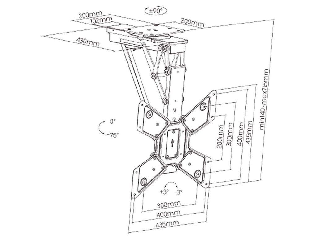 Nedis TVCM5850BKUniverzální sklopný VESA držák s dálkovým ovládáním vhodný pro instalaci televizoru na strop. Motorizované ovládání náklonu a otočná konstrukce pomáhá k dosažení optimálního sledovacího úhlu. Největší předností stojanu je ale možnost ovládání skrze mobilní aplikaci. Stačí stojan připojit k Wi-Fi síti a poté ho v aplikaci Nedis SmartLife začlenit do vaší chytré domácnosti. Vzdálenost od stropu je 14 až 71,5 cm (dle úhlu náklonu). Antikolizní funkce zajišťuje bezpečnost vašeho televizoru a zabraňuje náhodnému poškození. Maximální zatížení stojanu je 30 kg.